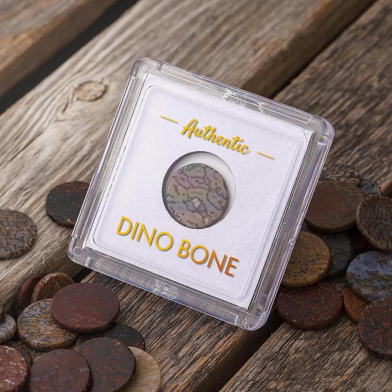 Own a piece of pre-history! These genuine fossilized dinosaur bone souvenir tokens are gently polished and packaged in a 2" x 2" plastic snap container. One side showcases the dinosaur bone and the other features a certificate of authenticity. The artifact is sealed with a clear, copper foil printed label. These dinosaur bone discs make an excellent gift for geology and history buffs!