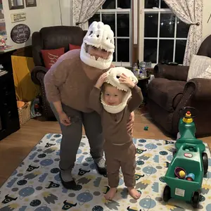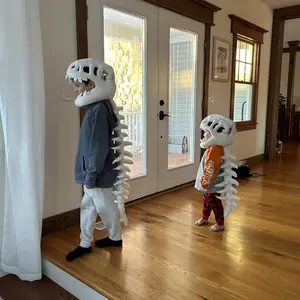 My grandson absolutely loves this dinosaur! Fits him perfectly, I believe I bought the smaller size . He runs around making Dino sounds. I highly recommend this. My grandson is 3 years old