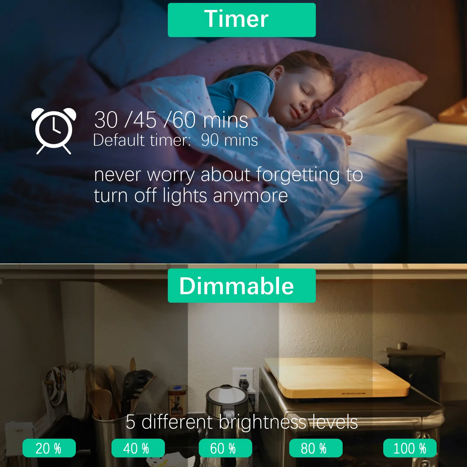 ·Dimmable: Customize your lighting to suit any setting. From a serene 30% in the bedroom to a vibrant 100% in the kitchen, adjustable brightness caters to various lighting needs.