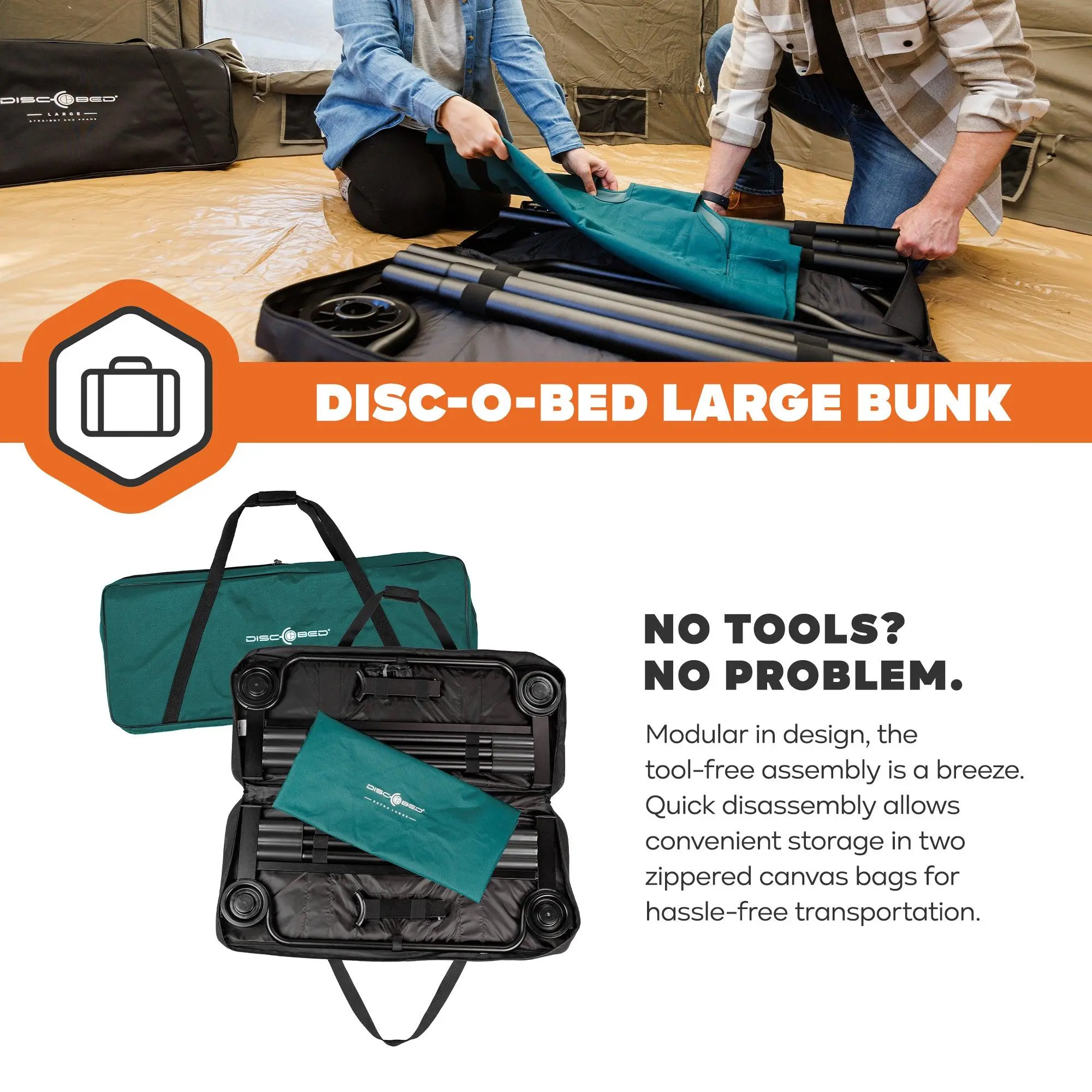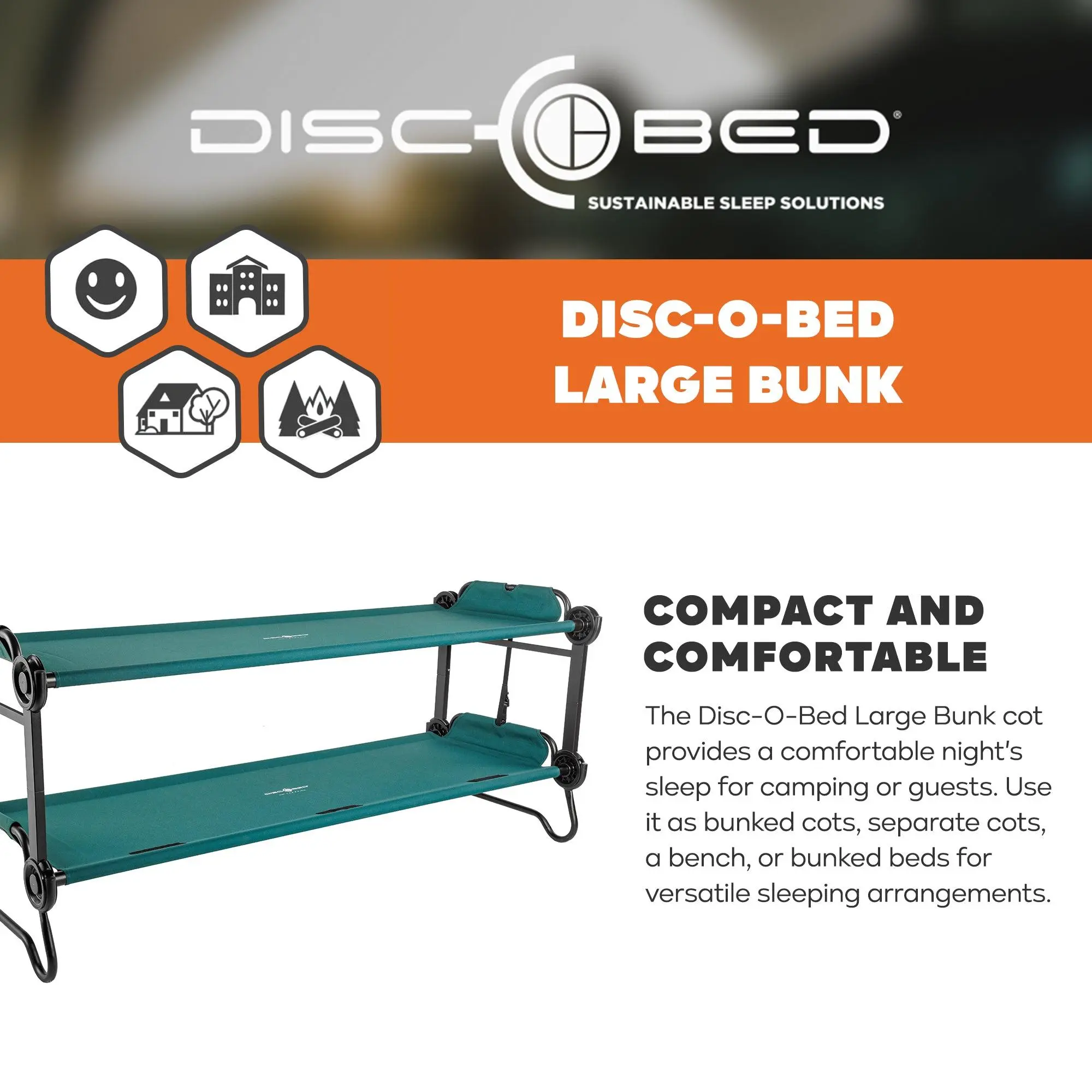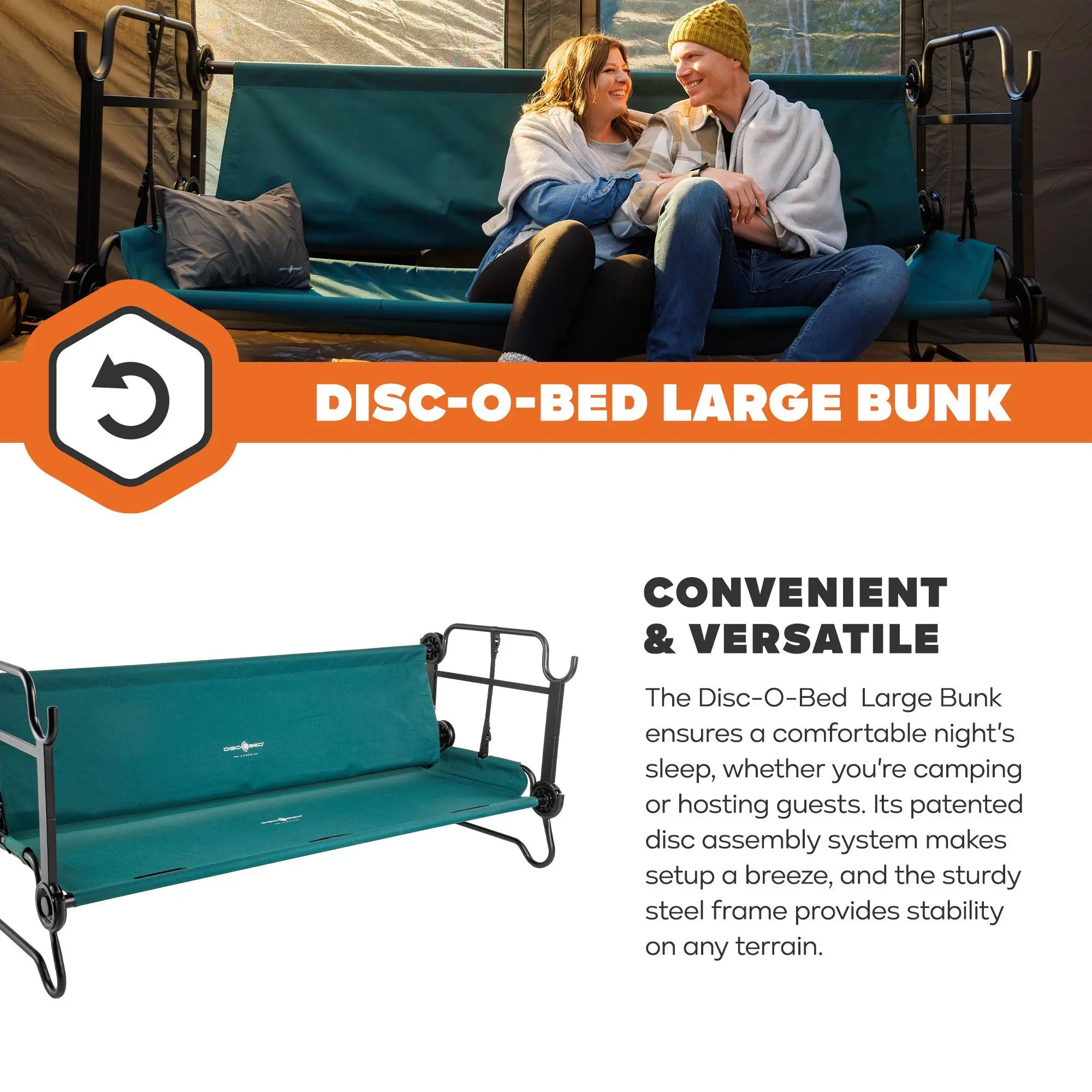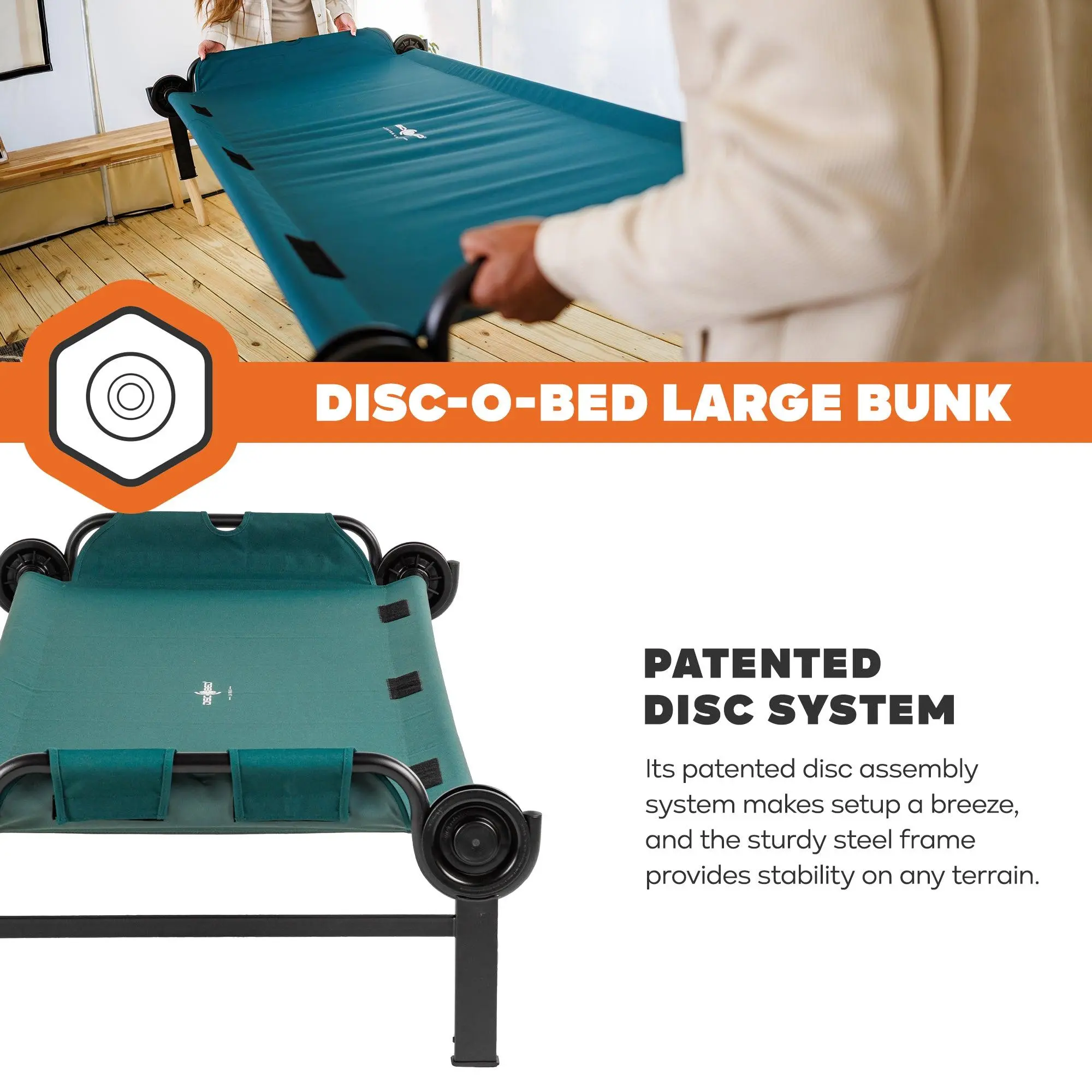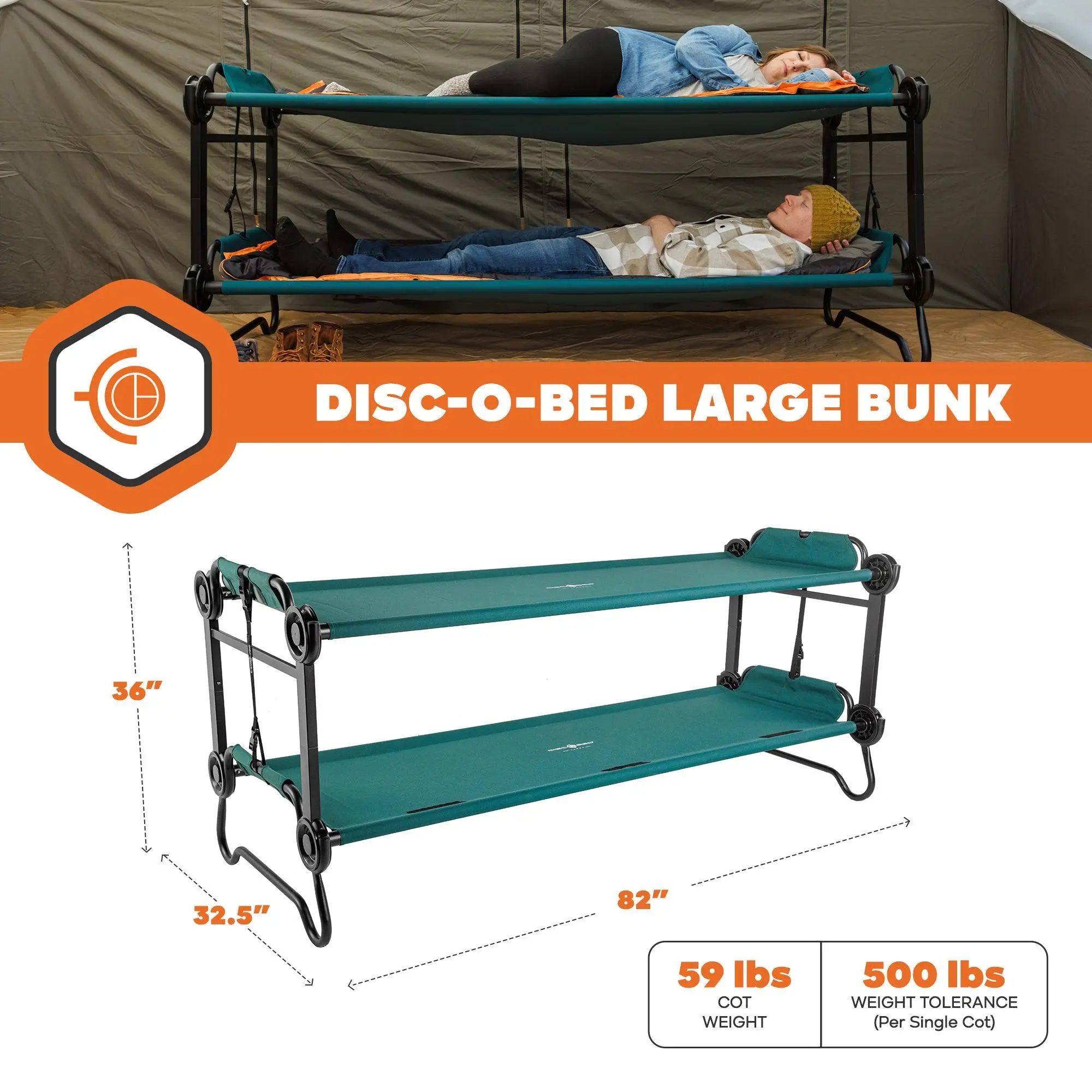 The Disc-O-Bed Large Bunk ensures a comfortable night's sleep, whether you're camping or hosting guests. Its patented disc assembly system makes setup a breeze, and the sturdy steel frame provides stability on any terrain. Say goodbye to uncomfortable middle bars for a restful night of sleep. The Disc-O-Bed Large system fits two people and maximizes floor space with an 11-inch ground clearance and 21-inch distance between cots. Its robust, rust-resistant, powder-coated steel frame can support up to 500 lbs per single cot. The high grade polyester sleeping deck is removable for easy cleaning, and the package includes two cots, two carry bags, stack adapters, and locking straps. Plus, it comes with a 5-Year Limited Manufacturer's Warranty. Upgrade your camping comfort today!