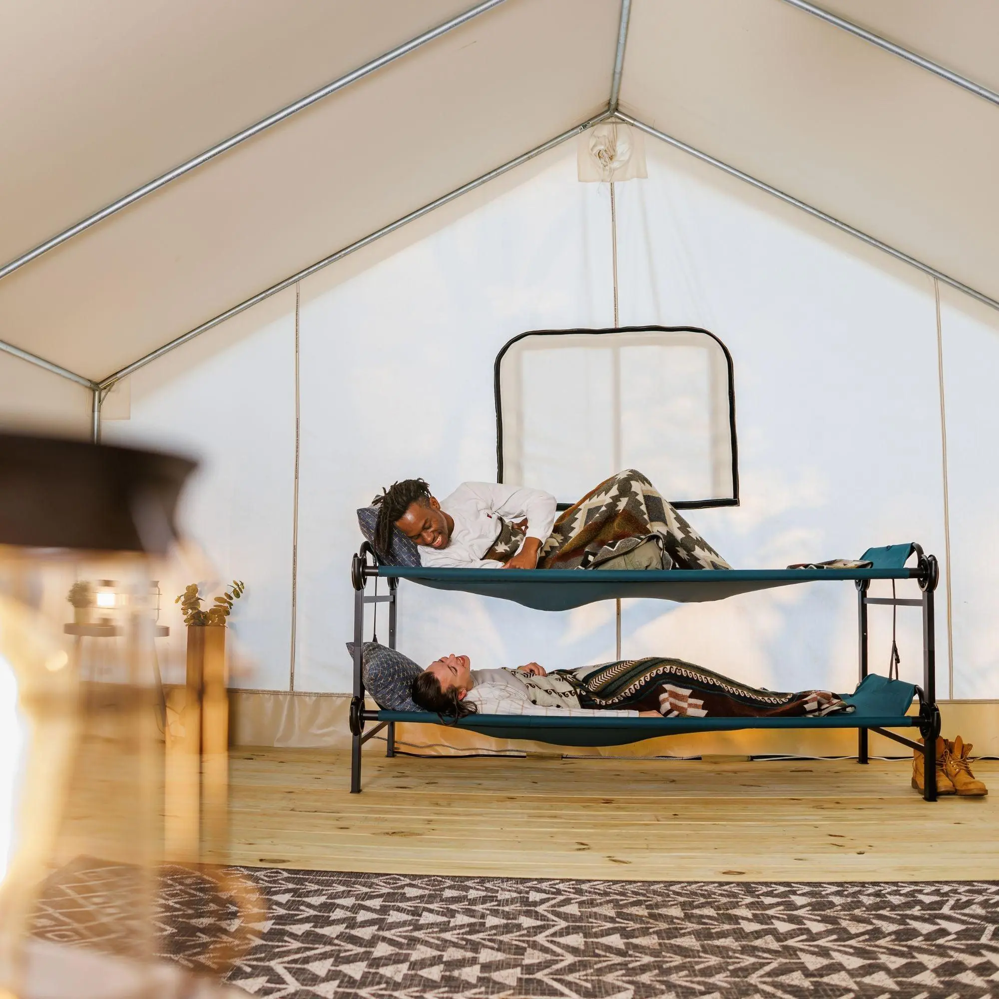 Compact and comfortable bunked cots that you can use as 2 separate cots, a bench, or bunked beds