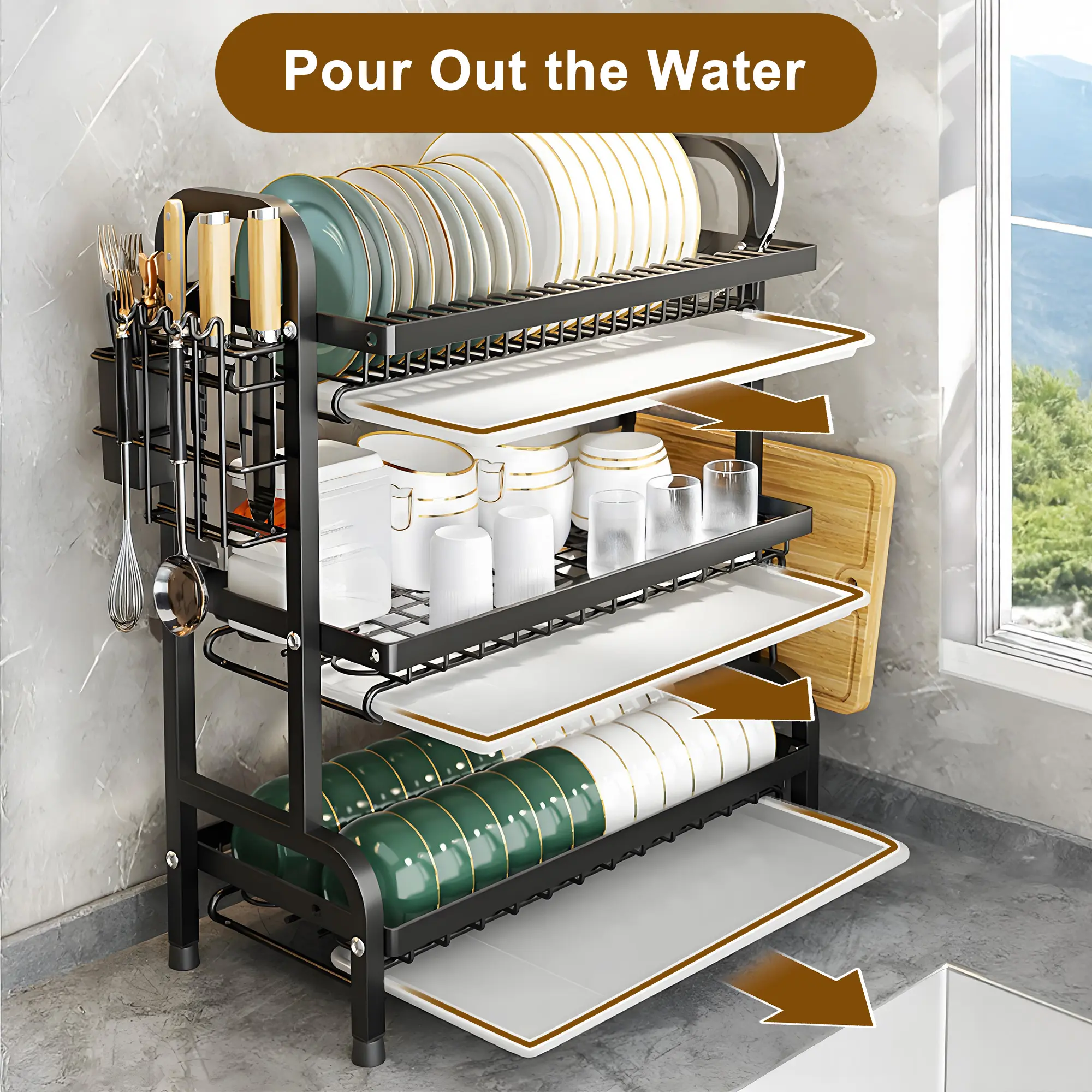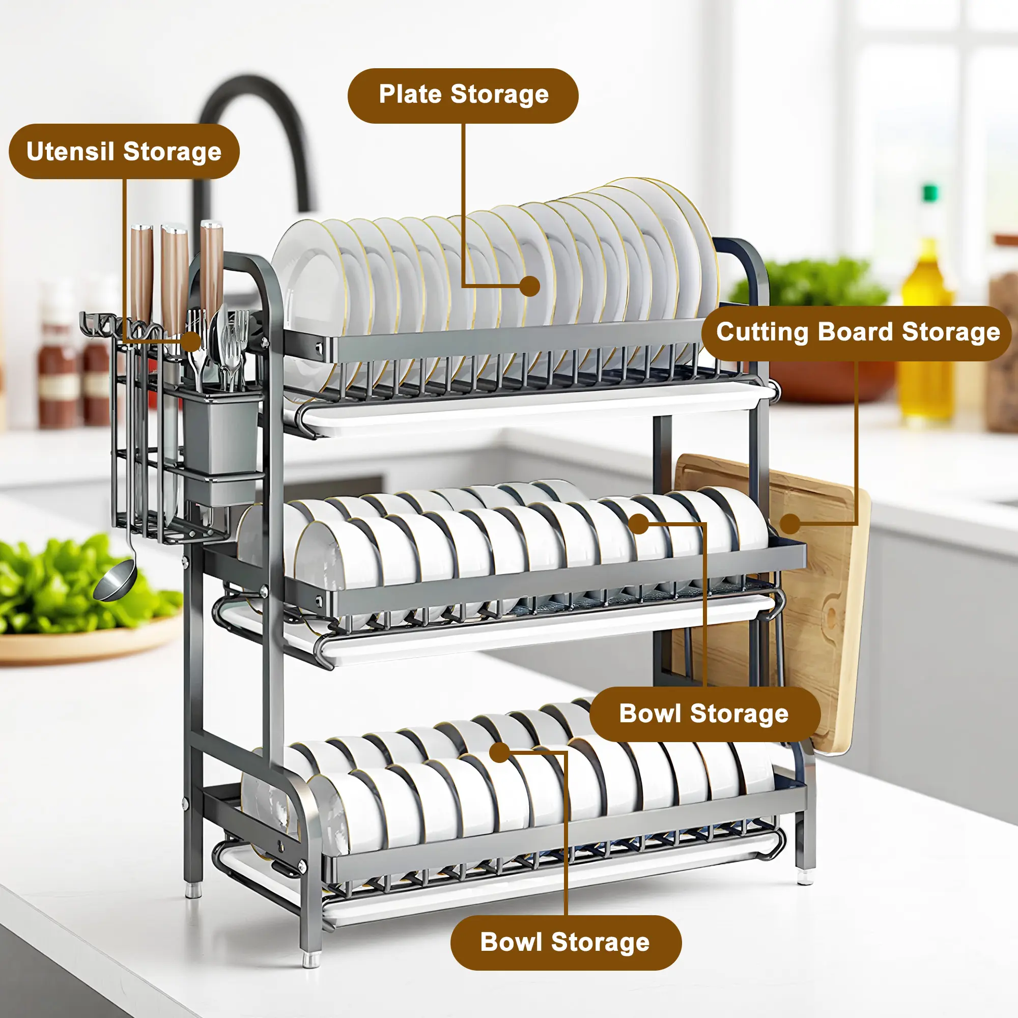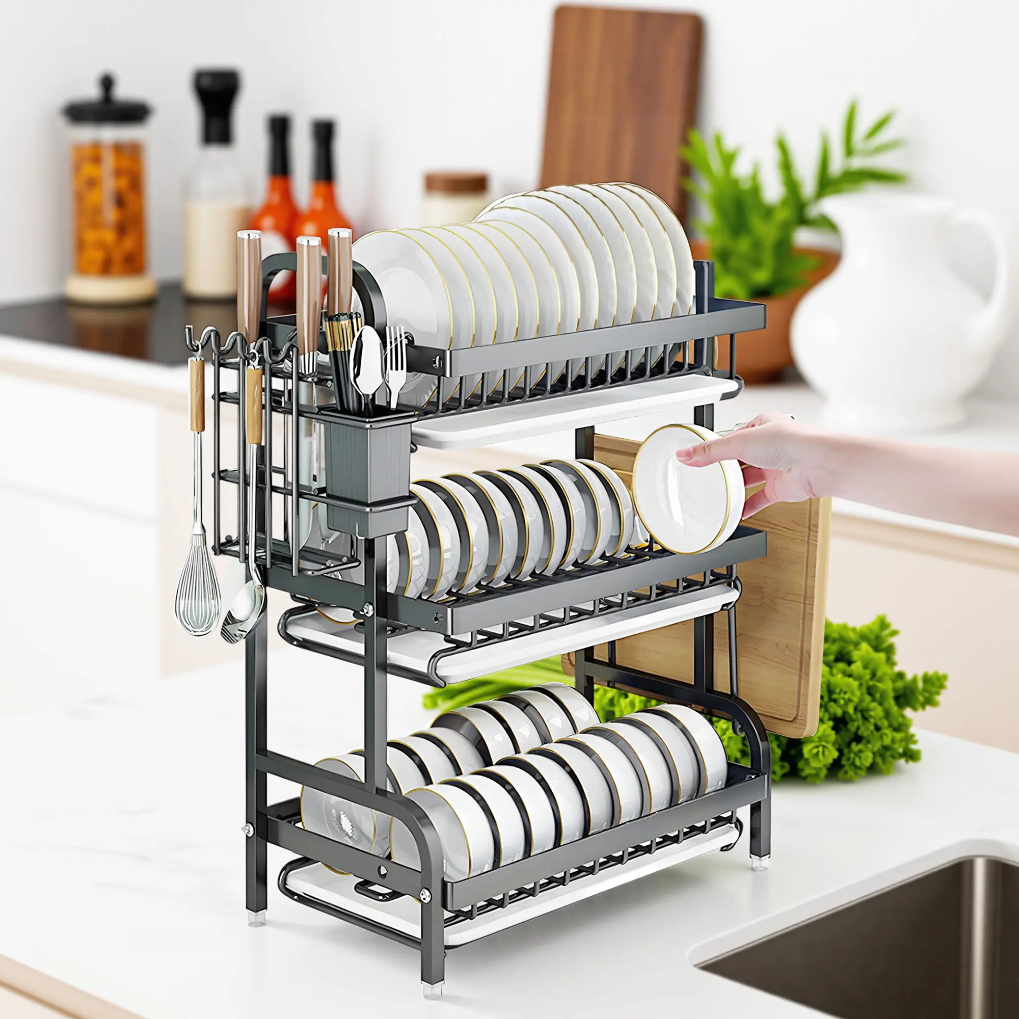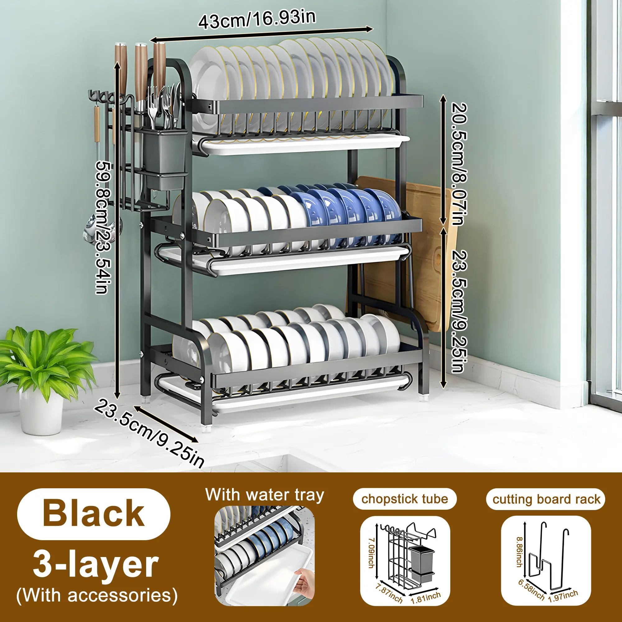 – Included: 1x Dish Rack, 1x Drainboard (3rd tier:3x Drainboards ), 1x Utensil Holder