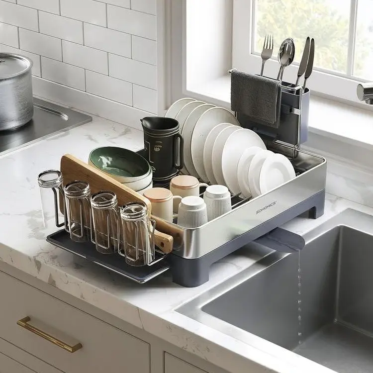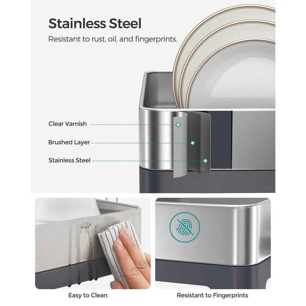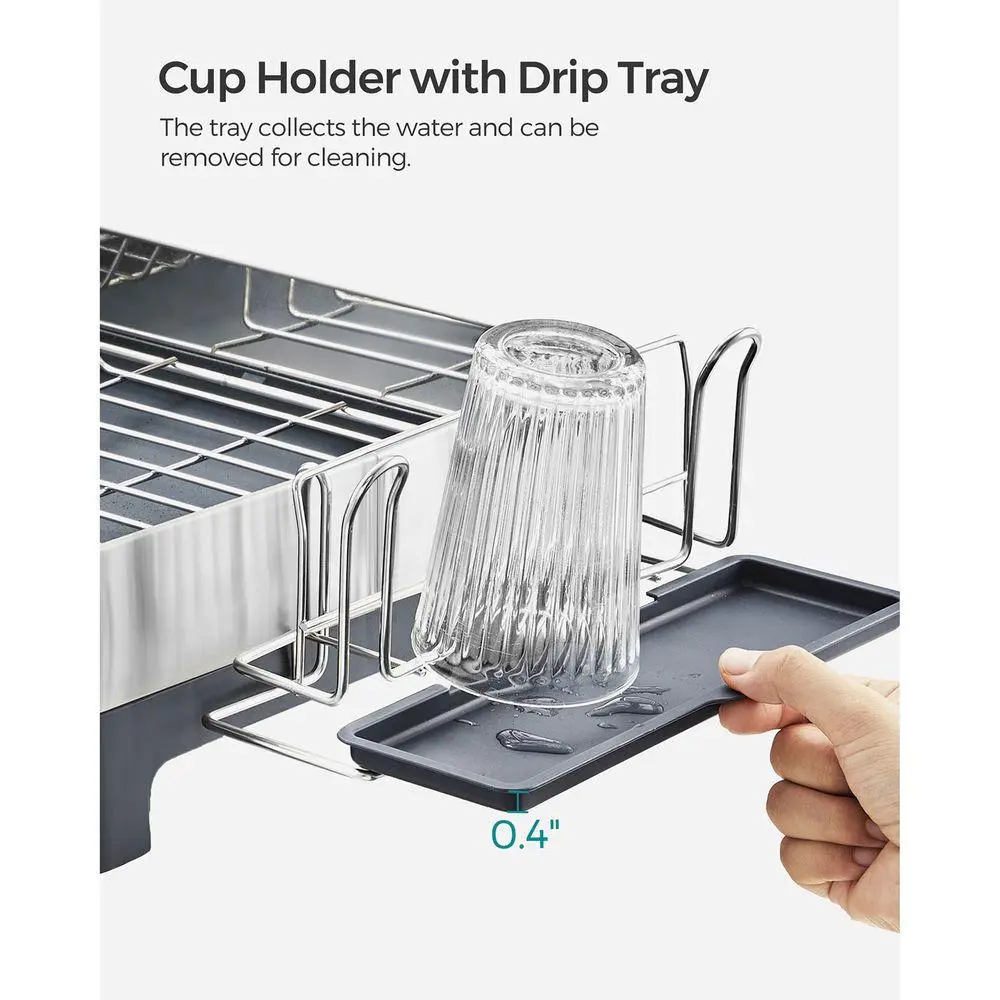 Versatile Convenience: This dish drying rack includes a 2-tier cup holder with a drip tray, a utensil holder, and a cutting board holder, providing easy organization for all your kitchen essentials. Made from fingerprint-resistant stainless steel, this dish drainer is both functional and stylish. Keep your kitchen clean and organized with this compact and convenient dish drying rack.