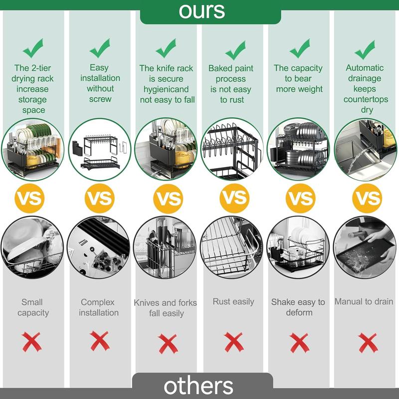 Non-Slip and Sturdy Drain Rack: This double-layer drain rack is made of high-strength 304 carbon steel. The dish rack has feet, and the bottom drain tray has four concave feet, ensuring the rack stays upright even when cups are hung on the side. This kitchen drain rack is more stable and non-slip, preventing wobbling and scratching the countertop.