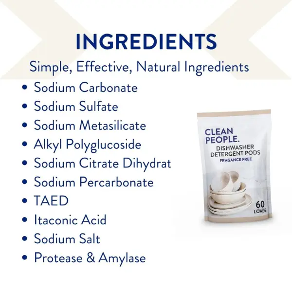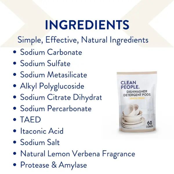 ·SPARKLING CLEAN WITHOUT HARSH CHEMICALS: Powered by earth- and plant-derived ingredients, Clean People's Dishwasher Detergent Pods naturally cut through grease & stuck-on food stains to leave dishes sparking with zero residue, streaks, or other mineral build-up. Safe, simple, effective, Clean People's products free from ethoxylates and cruelty-free.