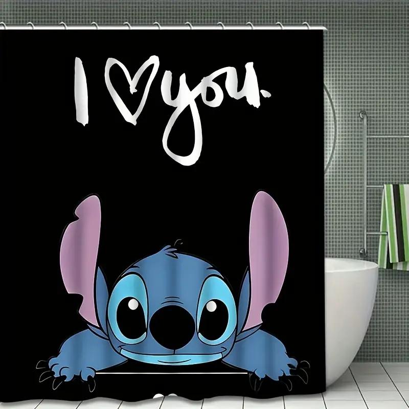 5. DISNEY CLASSIC Stitch Shower Curtain - "I Love You" Print, Waterproof Polyester with Hooks, Cute Cartoon Bathroom Decor