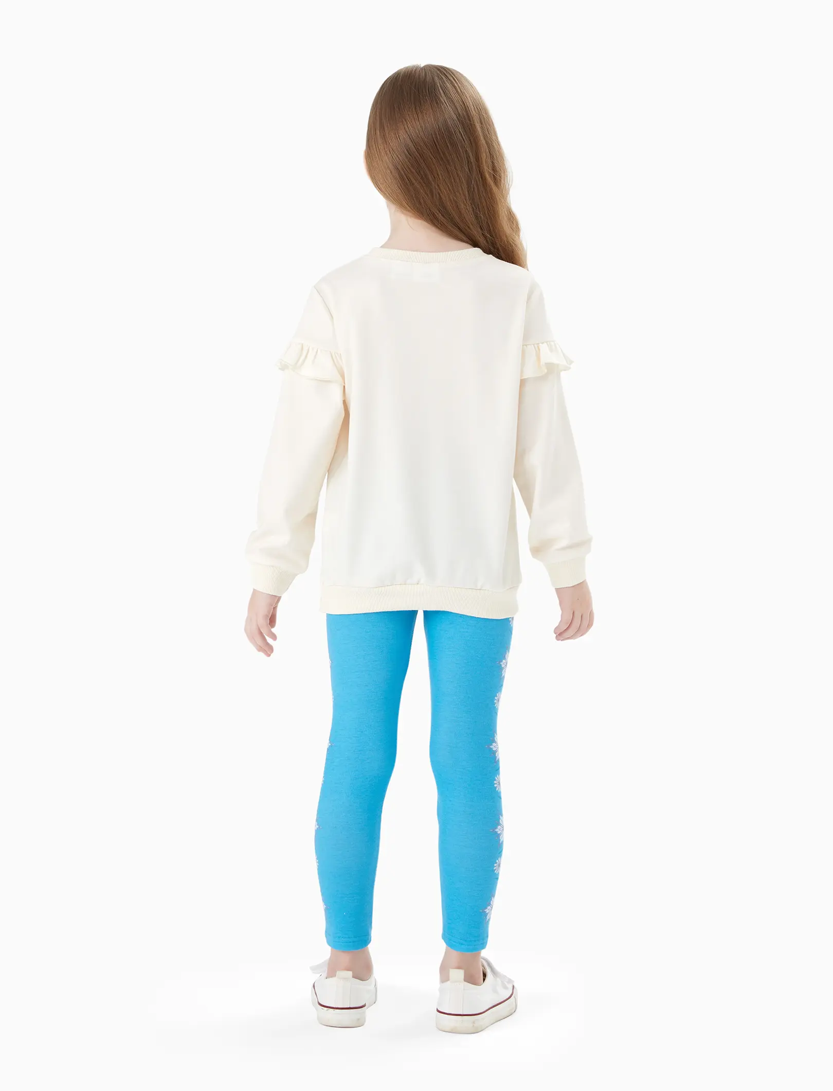 The sweatshirt features a soft, long-sleeve design. It's a great choice for layering or wearing alone. The set is versatile, suitable for various activities. Pair it with the matching leggings for a complete look. It's a delightful choice for your child's wardrobe.