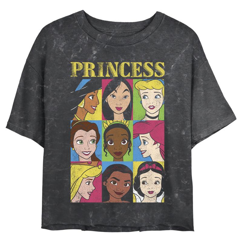 If you can't decide which of the Disney Princesses is your favorite… now you don't have to! Celebrate all of your favorites with this officially licensed Disney Princesses Princess Distressed Close-Up Poster Juniors' Graphic Mineral Wash Crop T-Shirt. Jasmine, Mulan, Cinderella, Belle, Tiana, Ariel, Aurora, Moana, and Snow White are all portrayed in a box with the word "Princess" at the top. Dress in style this season with these new designs that are perfect for Disney fans everywhere!