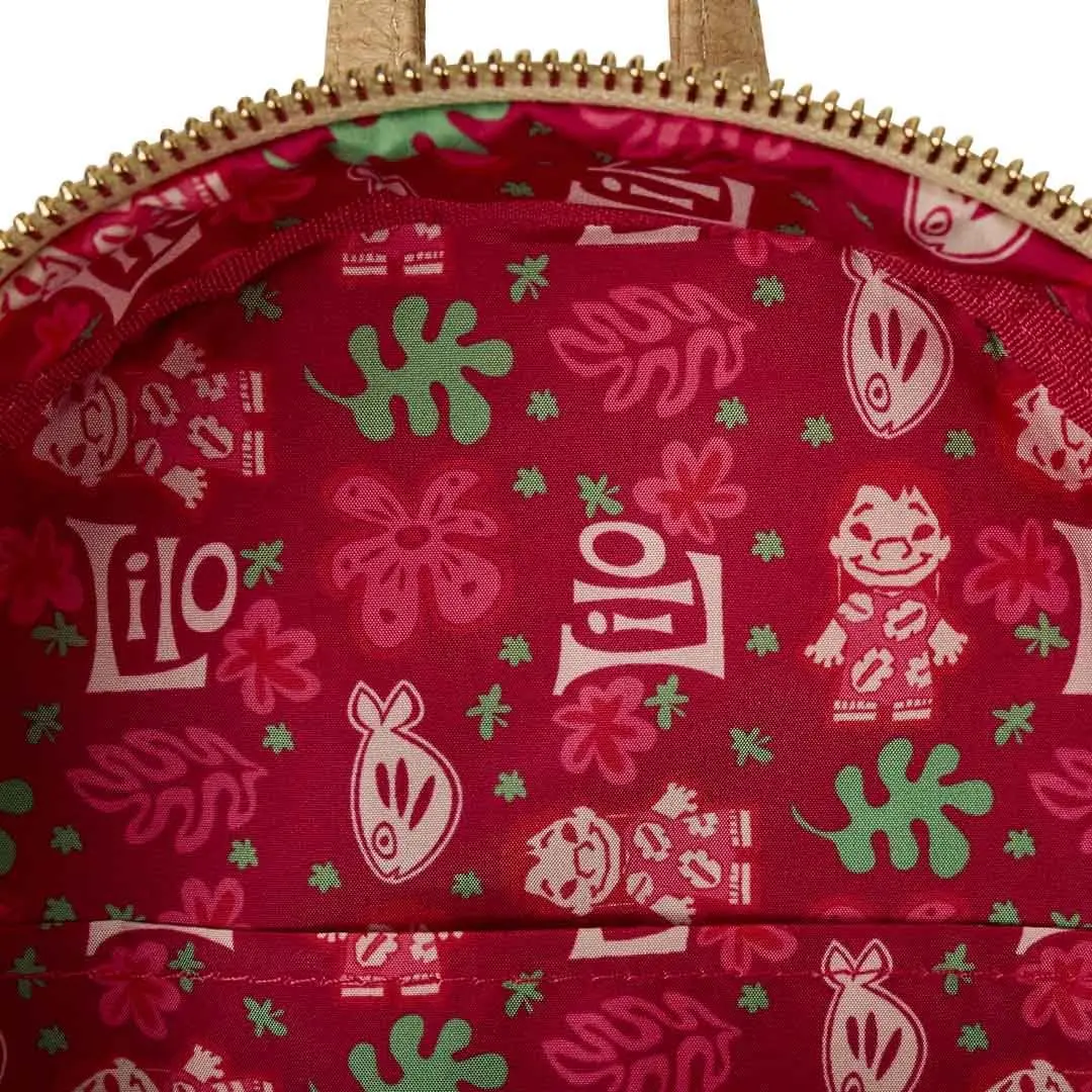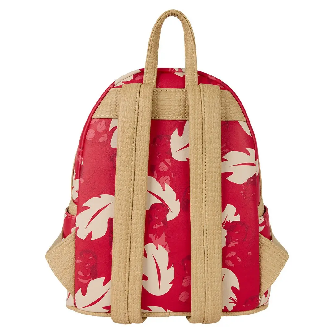 This bag features the same pattern as Lilo's red dress, and you can find images of Lilo all throughout the design. Woven faux leather gives an extra fun feel to the straps. Plus, stretching across the front pocket is a golden chain with enamel charms of a pineapple, Scrump, a hibiscus flower, and a ukulele.