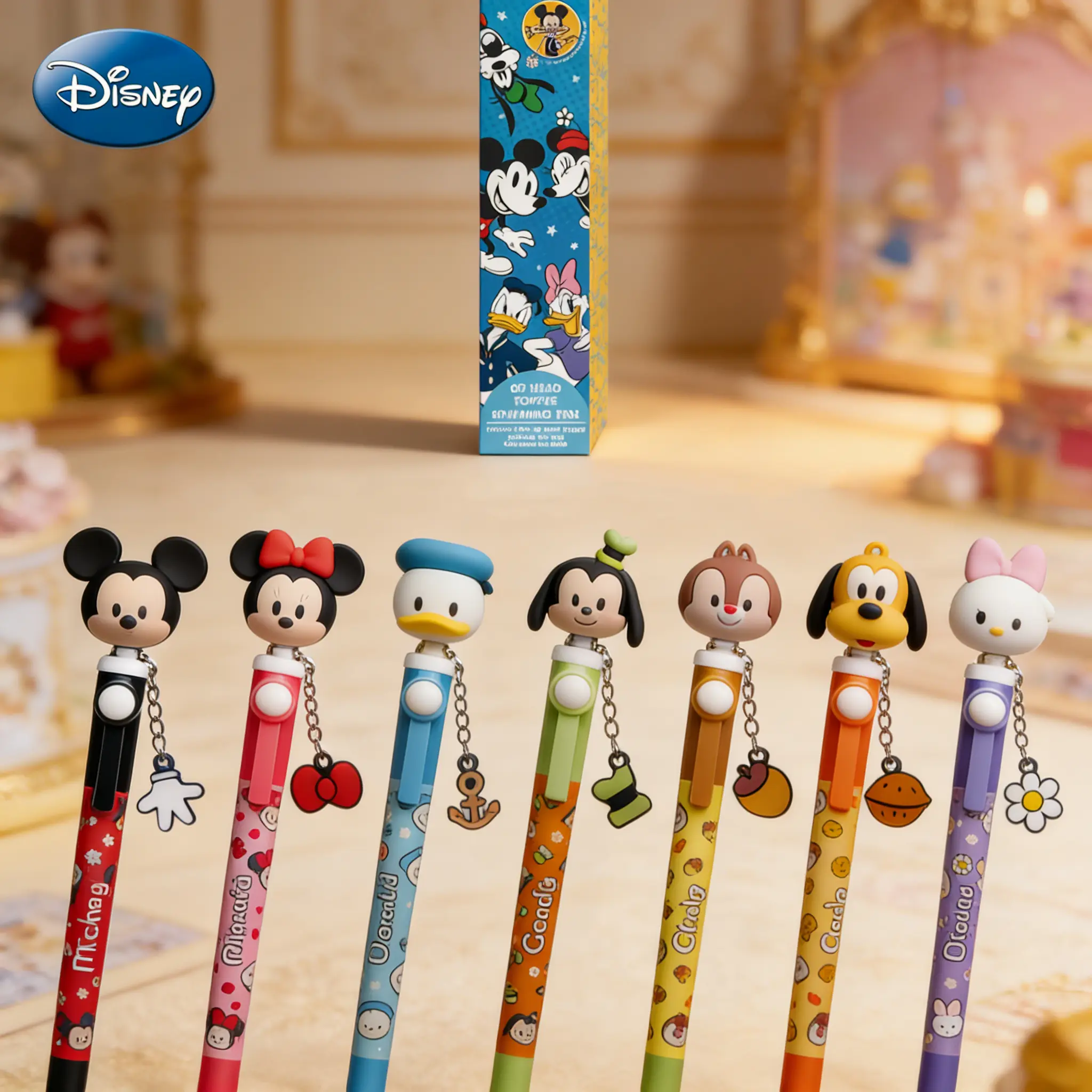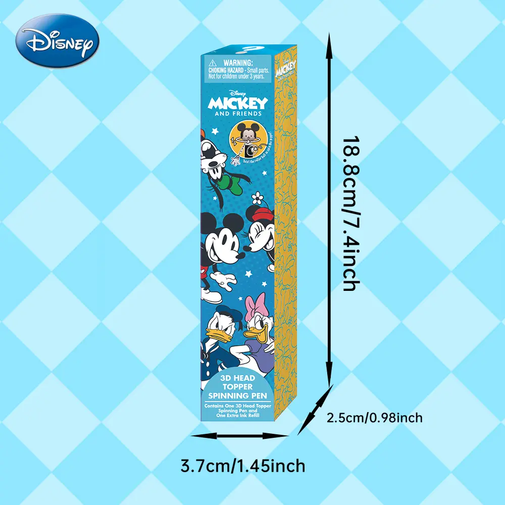 ·This Disney Mickey Pen Blind Box comes with a 1PC officially licensed PVC 3D head topper. It features a spinning pen design, perfect for collectors and fans. The pen includes beloved characters like Mickey, Minnie, Donald, Goofy, Chip, Dale, and Daisy.
