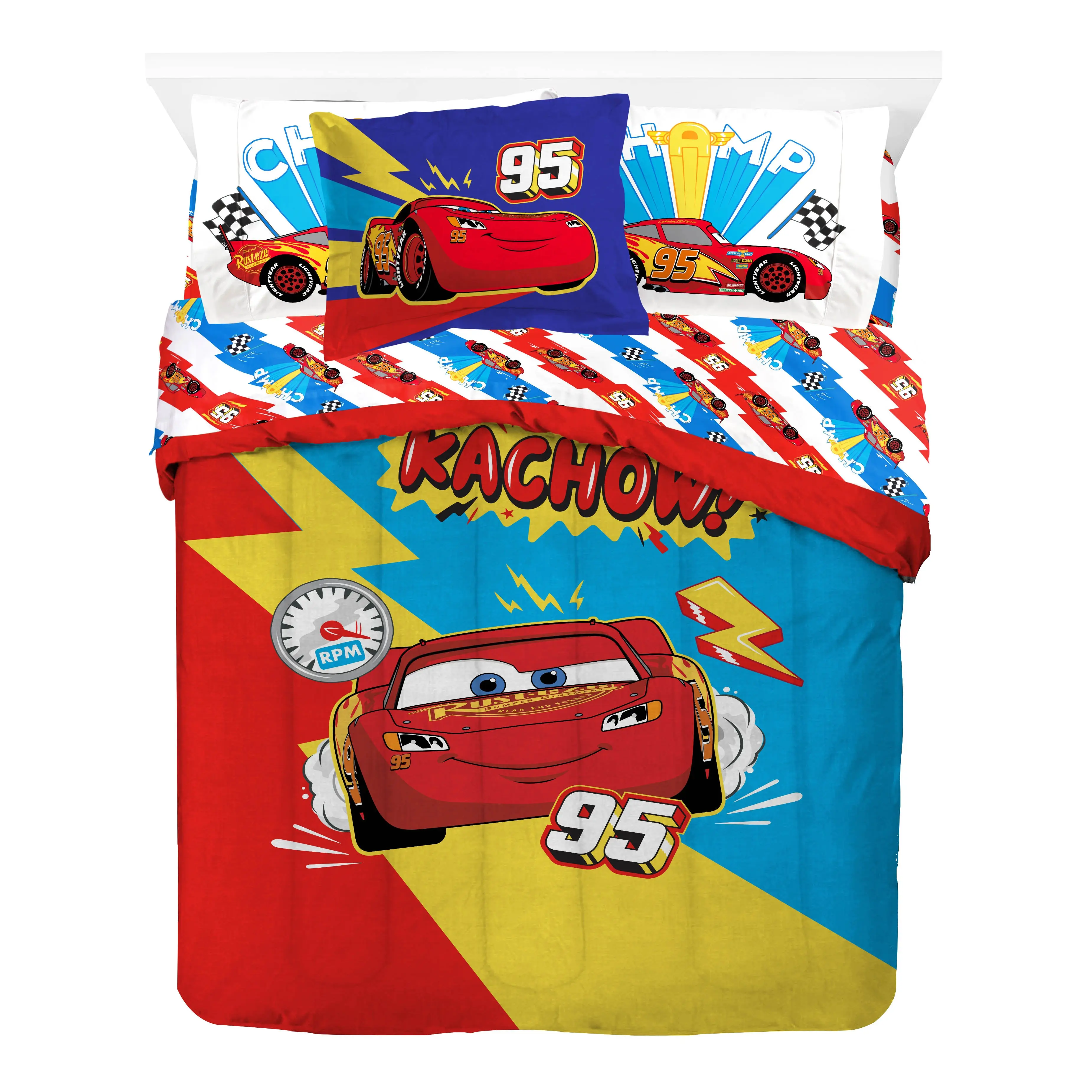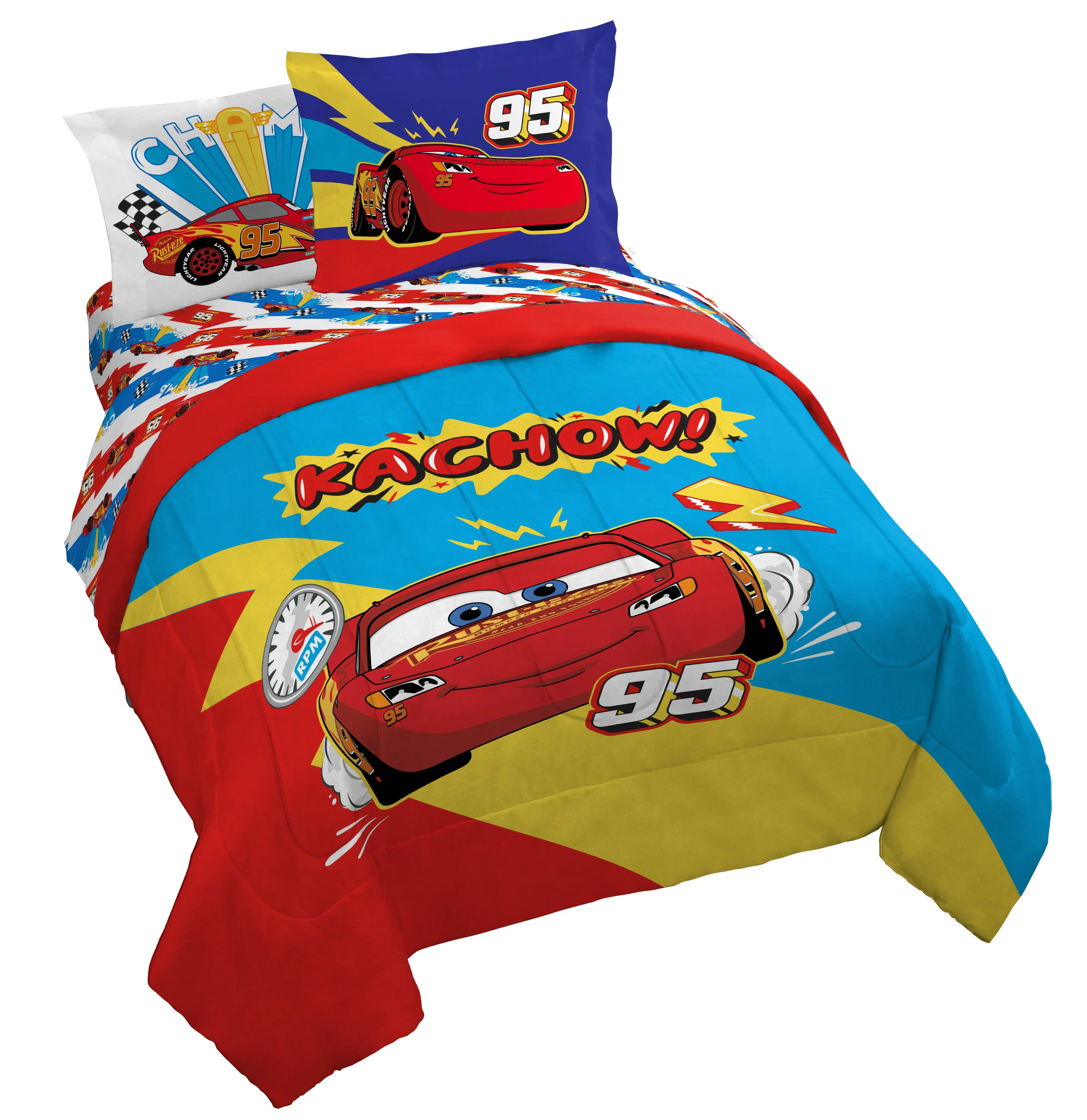 Kachow! Your child will be racing to bed with our Cars bed set featuring Lightning McQueen! This set includes a twin comforter, fitted sheet, flat sheet, pillowcase, and sham. The soft microfiber material ensures a cozy night's sleep. Let the joyful dreams begin!