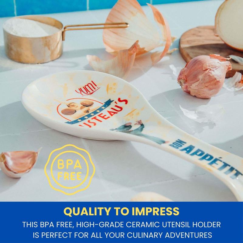 Whip up something amazing with this exclusive spoon rest featuring Remy from Disney and Pixar's Ratatouille. Bon Appetit. This kitchen helper holds a variety of utensils including spoons, ladles, spatulas, and other essentials. Just your everyday gourmet. No more messy countertops while you work your magic inn the kitchen. Quality to impress. This BPA free, high-grade ceramic utensil holder is perfect for all your culinary adventures. Microwave and top-rack dishwasher safe.