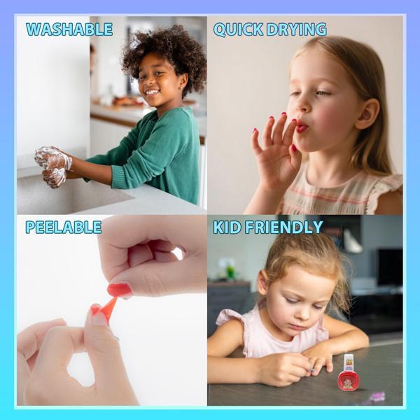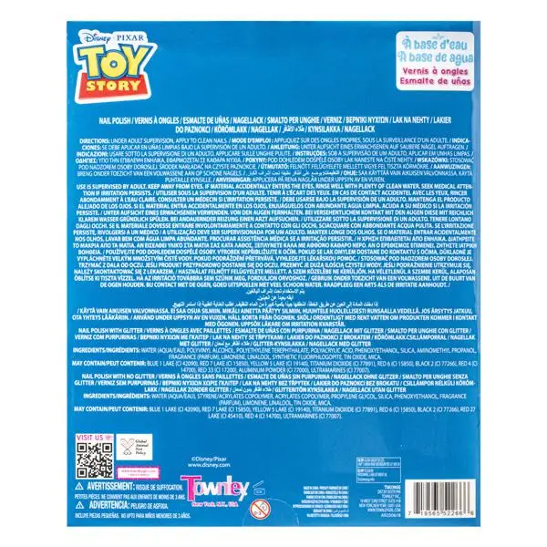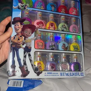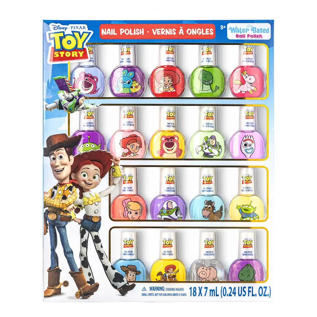This 18-pack nail polish set is designed for kids and girls aged 3+. It features water-based, peelable nail polish with glittery, shimmery, and opaque colors. The set includes fun designs inspired by Disney Pixar Toy Story.