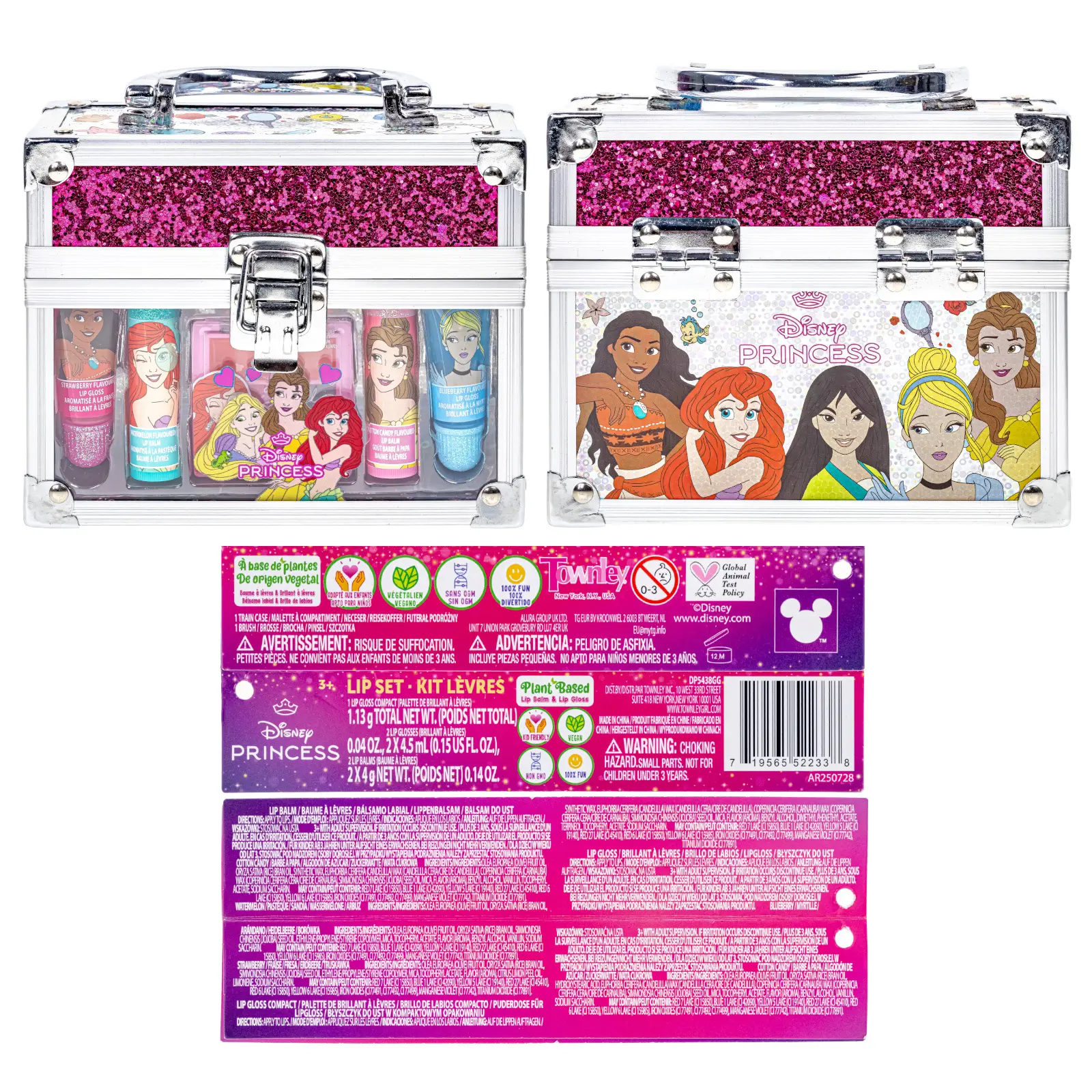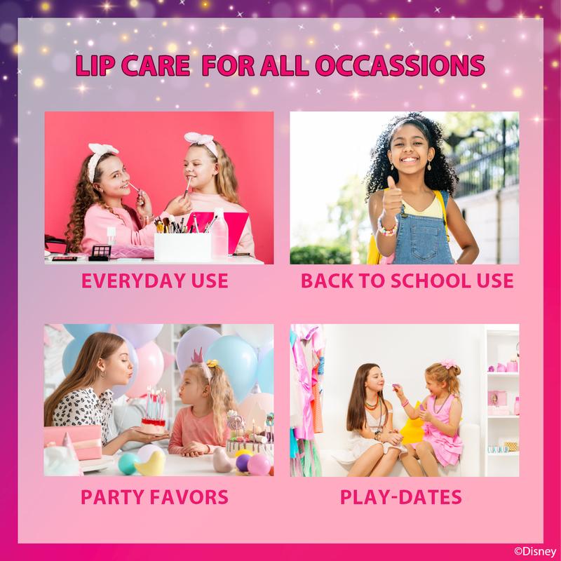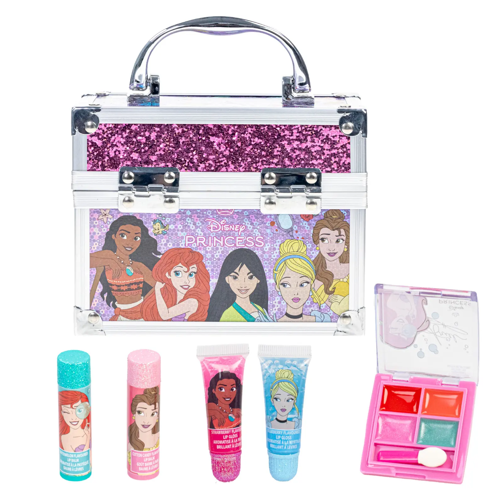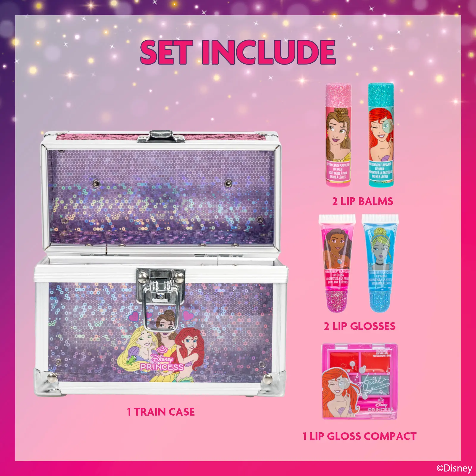 The Disney Princess Mini Train Case set includes two lip balms, two shimmering lip glosses, and a trendy mini lip gloss compact. Perfect for aspiring princesses, this set is crafted with care for children. Non-toxic, water-based formulas ensure a safe and enjoyable experience. Your child will thrive in a vibrant adventure of colors and personal style.