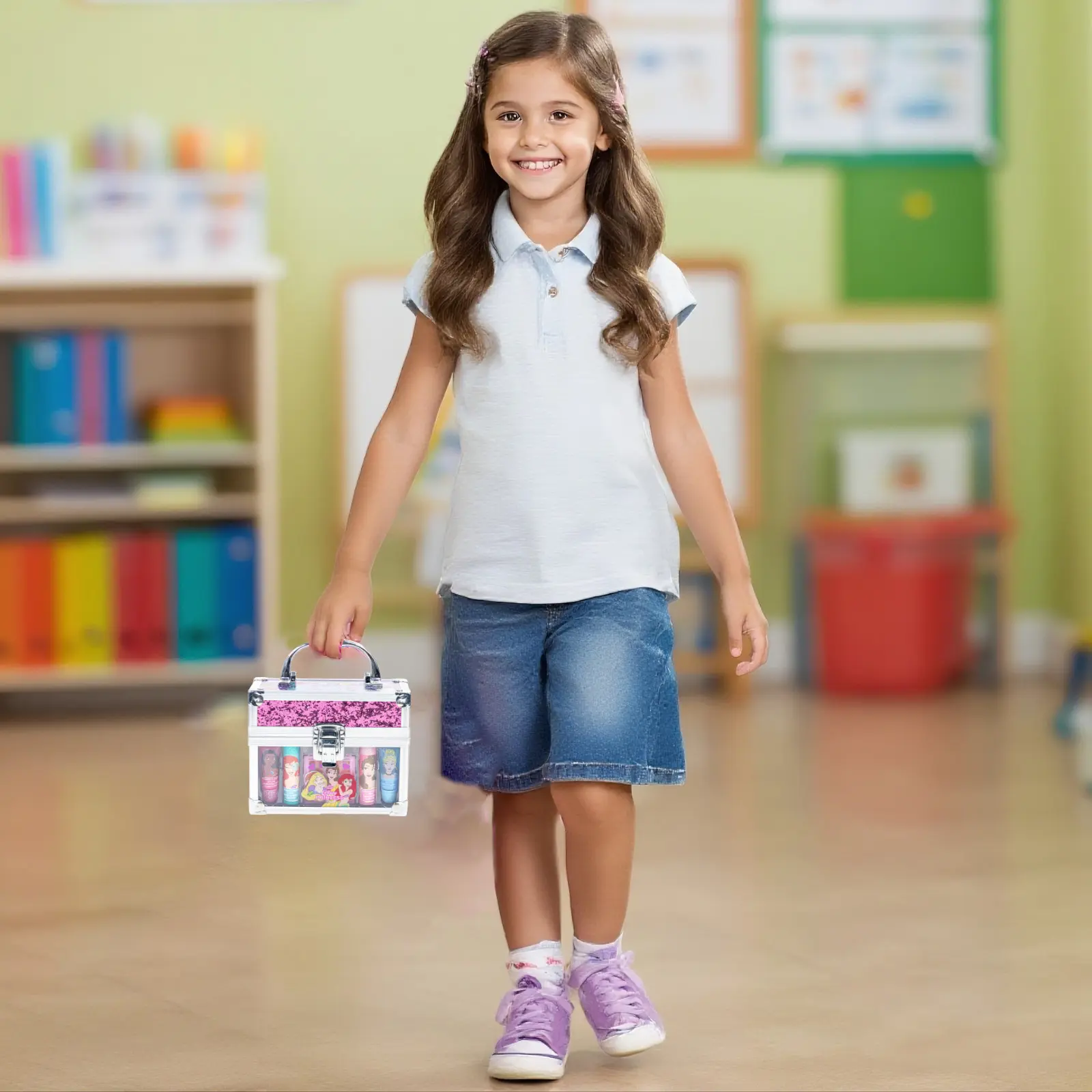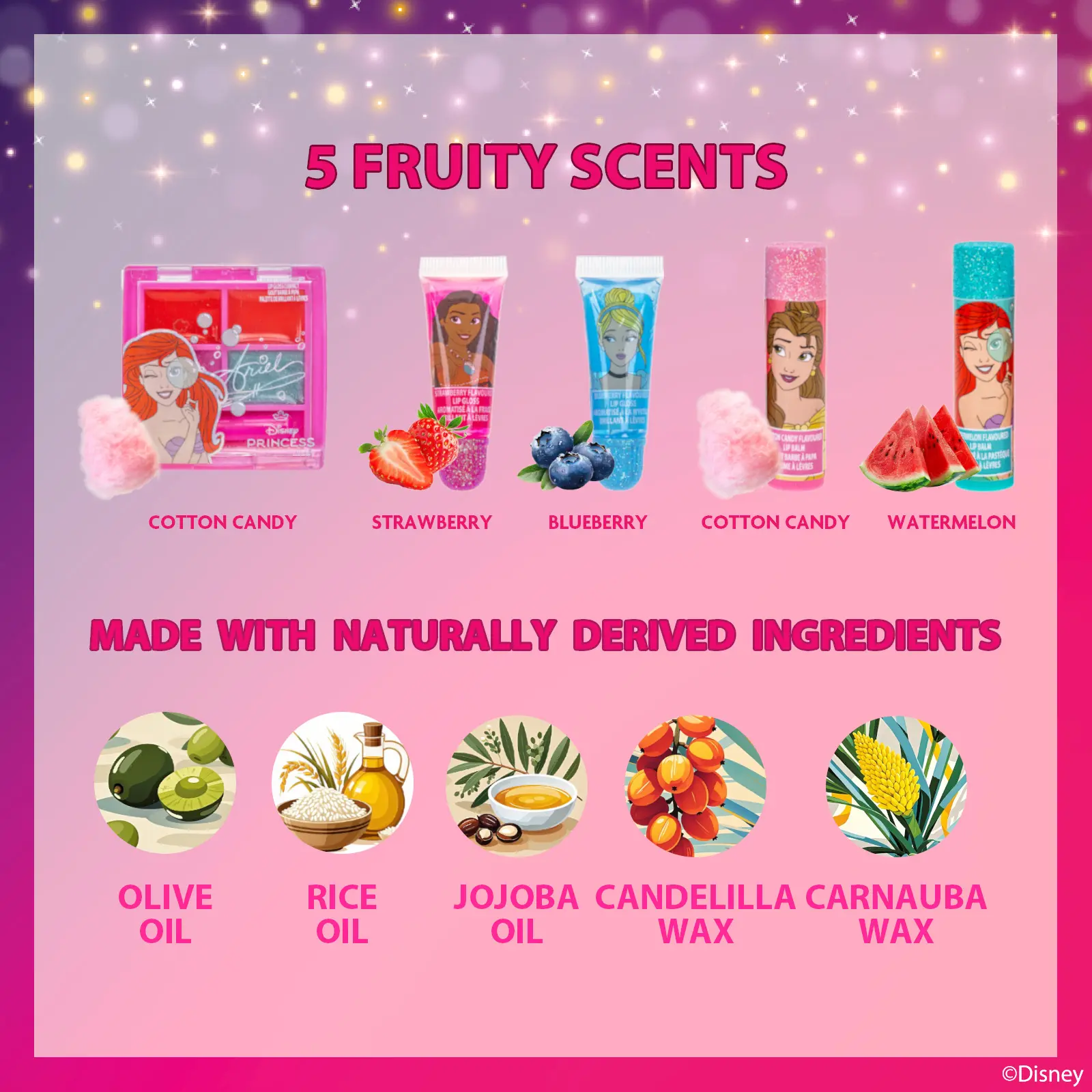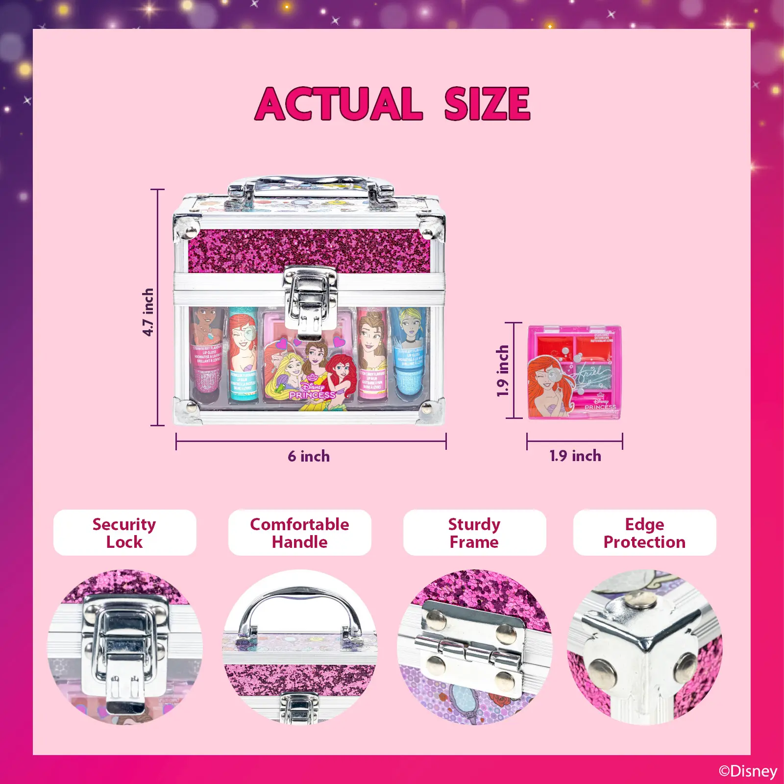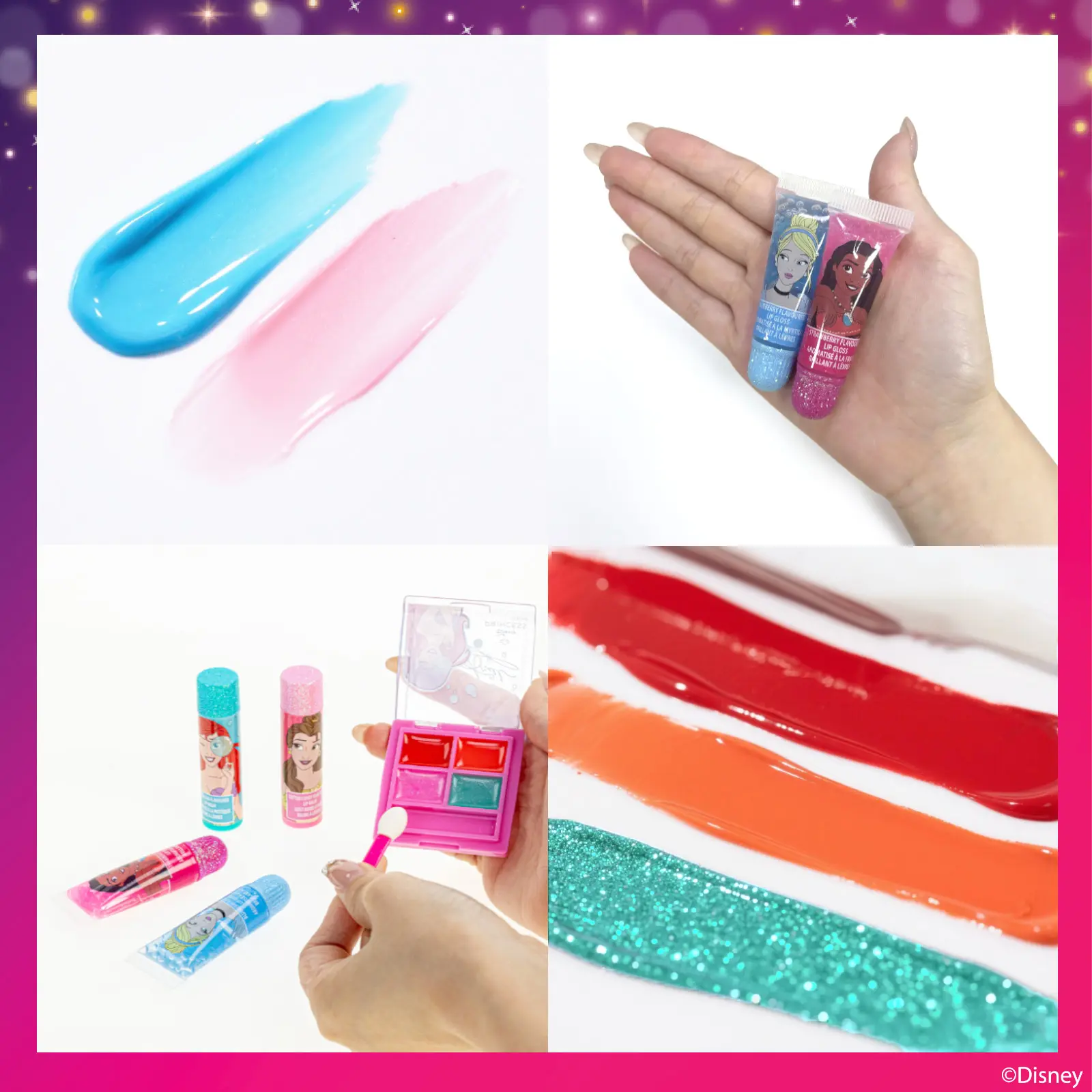 The Disney Princess Mini Train Case set includes two lip balms, two shimmering lip glosses, and a trendy mini lip gloss compact. Perfect for aspiring princesses, this set is crafted with care for children. Non-toxic, water-based formulas ensure a safe and enjoyable experience. Your child will thrive in a vibrant adventure of colors and personal style.