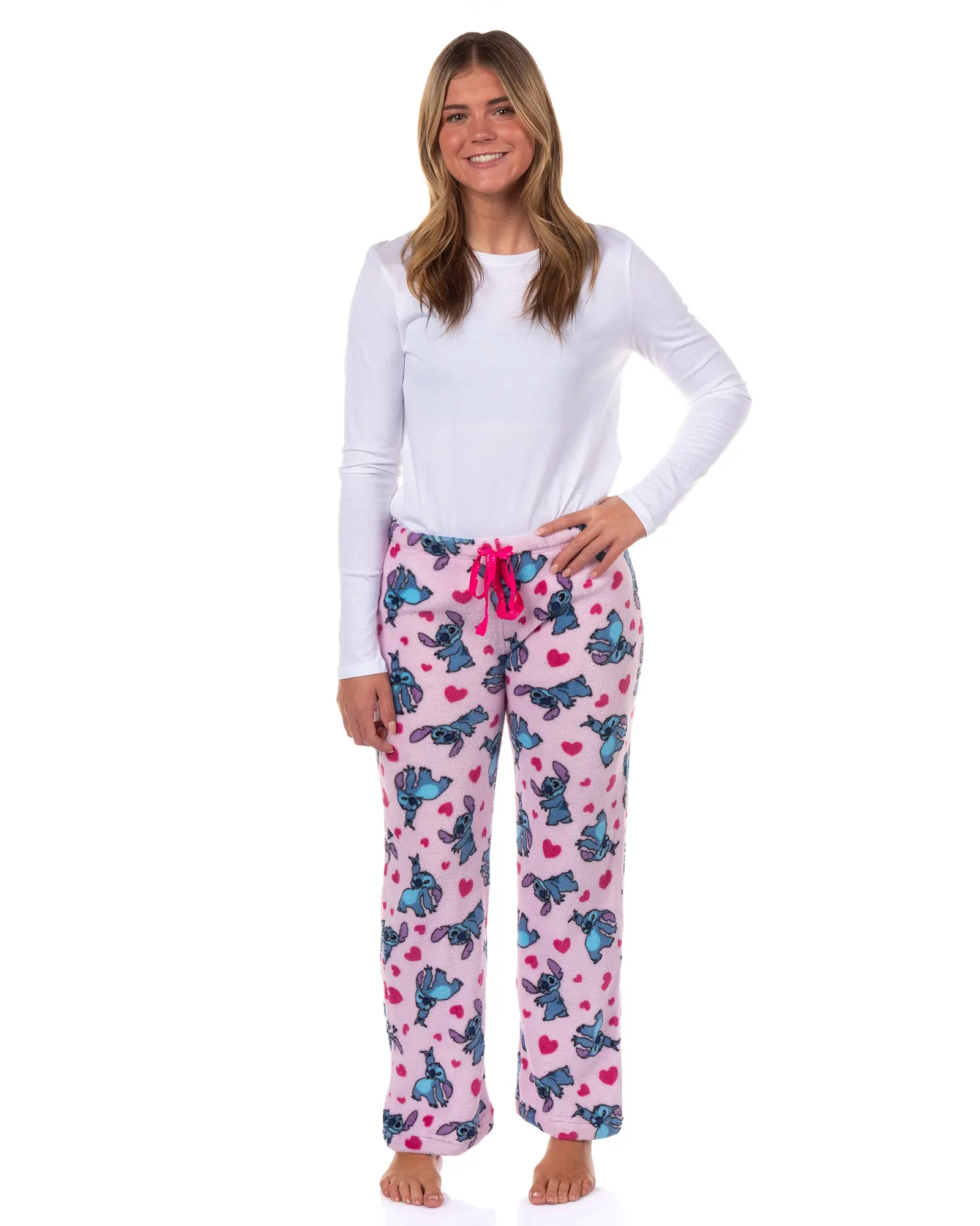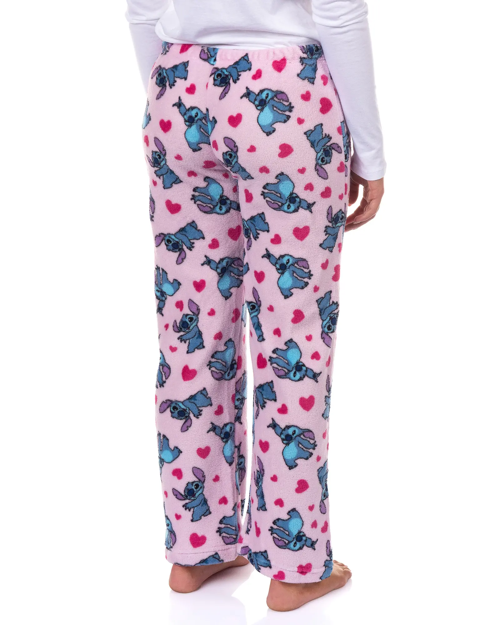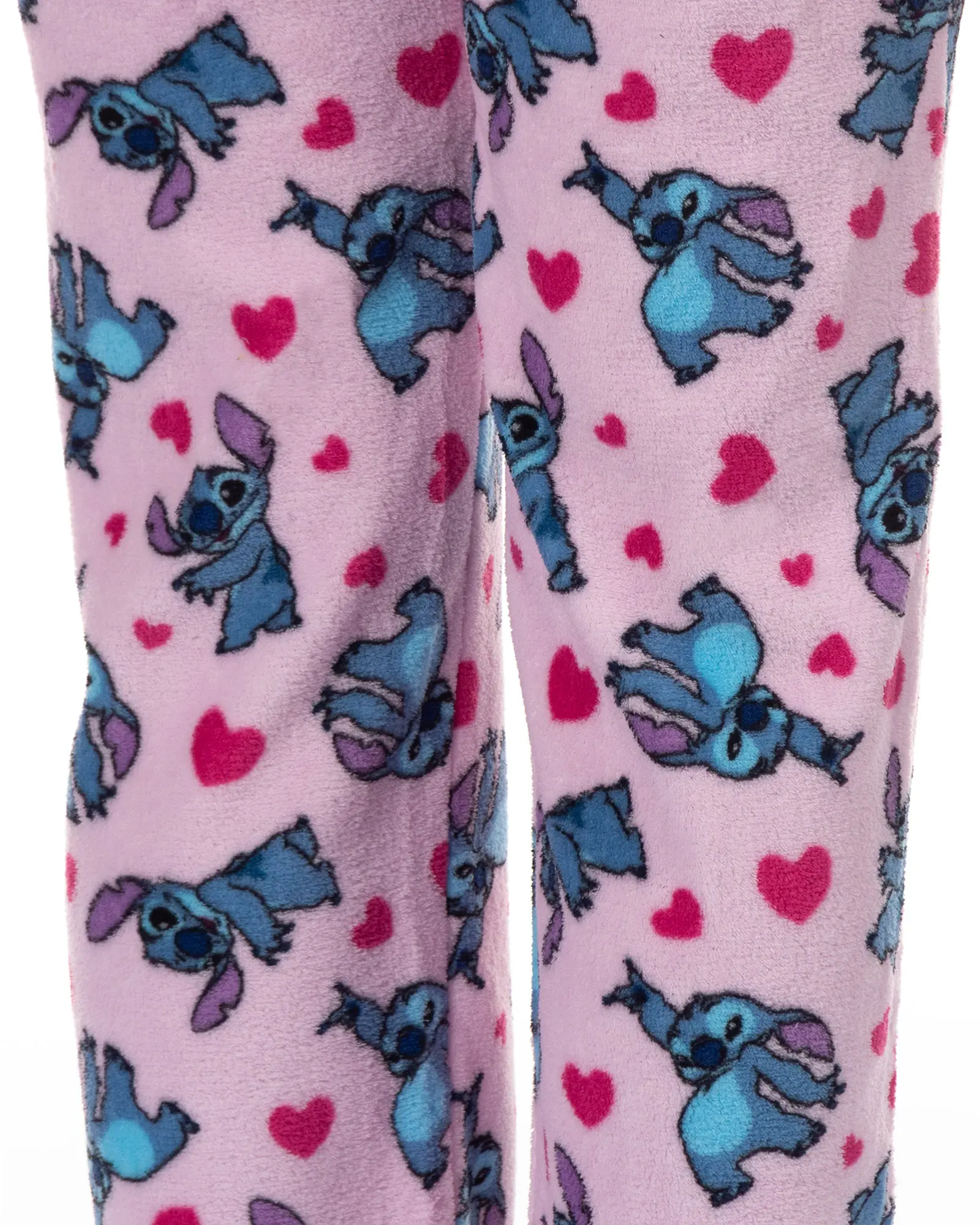 Experience comfort and character with these Disney Stitch plush fleece pajama pants. Designed with an all-over Stitch print accented by hearts set against a light pink background. These soft and cozy pajama bottoms provide warmth with a playful touch. Made from 100% polyester, they offer a lightweight, comfy feel while maintaining durability and vibrant colors wash after wash.