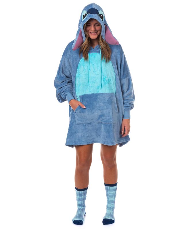 Built for comfort, this sleep hoodie offers a relaxed, oversized fit that works well as pajamas, loungewear, or a casual layer. Made from 100% polyester, it’s lightweight yet warm, and easy to care for with machine-washable instructions. Whether at home, in a dorm, or on the go, this pajama hoodie set is designed to keep you comfortable and cozy all day long. Playful Character Design: This dorm sleep shirt features an all-over blue plush fleece print of Disney’s Stitch. The detailed artwork brings a fun, recognizable look to your loungewear collection while adding personality to your everyday pjs Functional Hood, Pocket & Socks: The hood includes an embroidered Stitch face with large eyes, a nose, and 3D floppy ears for extra charm. It also has a drawstring for adjustability. A front kangaroo pocket keeps hands warm or holds small essentials, and the set includes plaid non-slip socks for a complete head-to-toe lounge outfit Oversized & Relaxed Fit: Designed for maximum comfort, this pajama hoodie offers a roomy, oversized shape. The gown hits just above the knee, giving coverage while staying breathable Easy Care: Made from 100% polyester fleece, this dorm sleep shirt delivers softness, warmth, and durability. To maintain the material, turn it inside out and wash in cold water on a gentle cycle, then tumble dry on low Versatile Wear: This oversized sleep hoodie is designed for more than bedtime. Wear it for lounging at home, relaxing in the dorm, cozying up at a sporting event, or layering for casual downtime