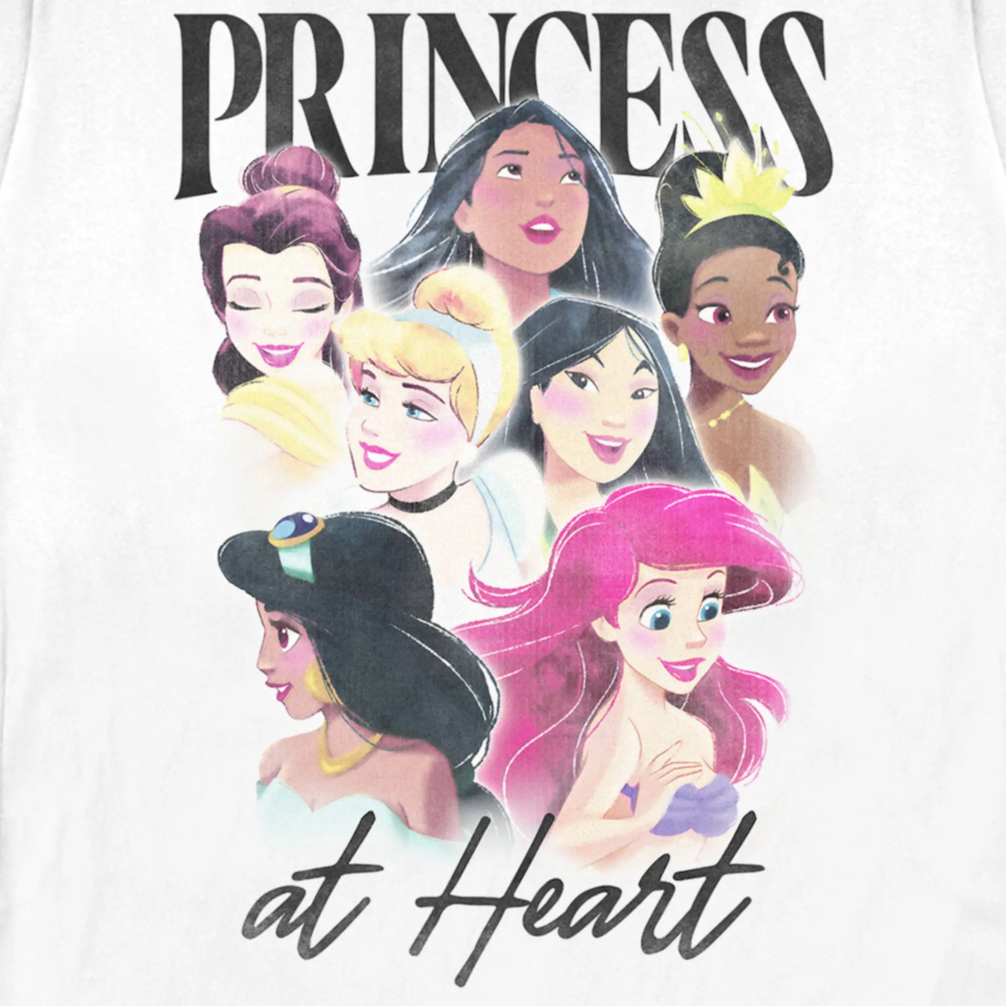 Strut your stuff with this stylish new women's t-shirt that is perfect for every occasion! Featuring Pocahontas, Belle, Tiana, Cinderella, Mulan, Jasmine, and Ariel in a cute collage along with the phrase: "Princess at Heart" across the front.