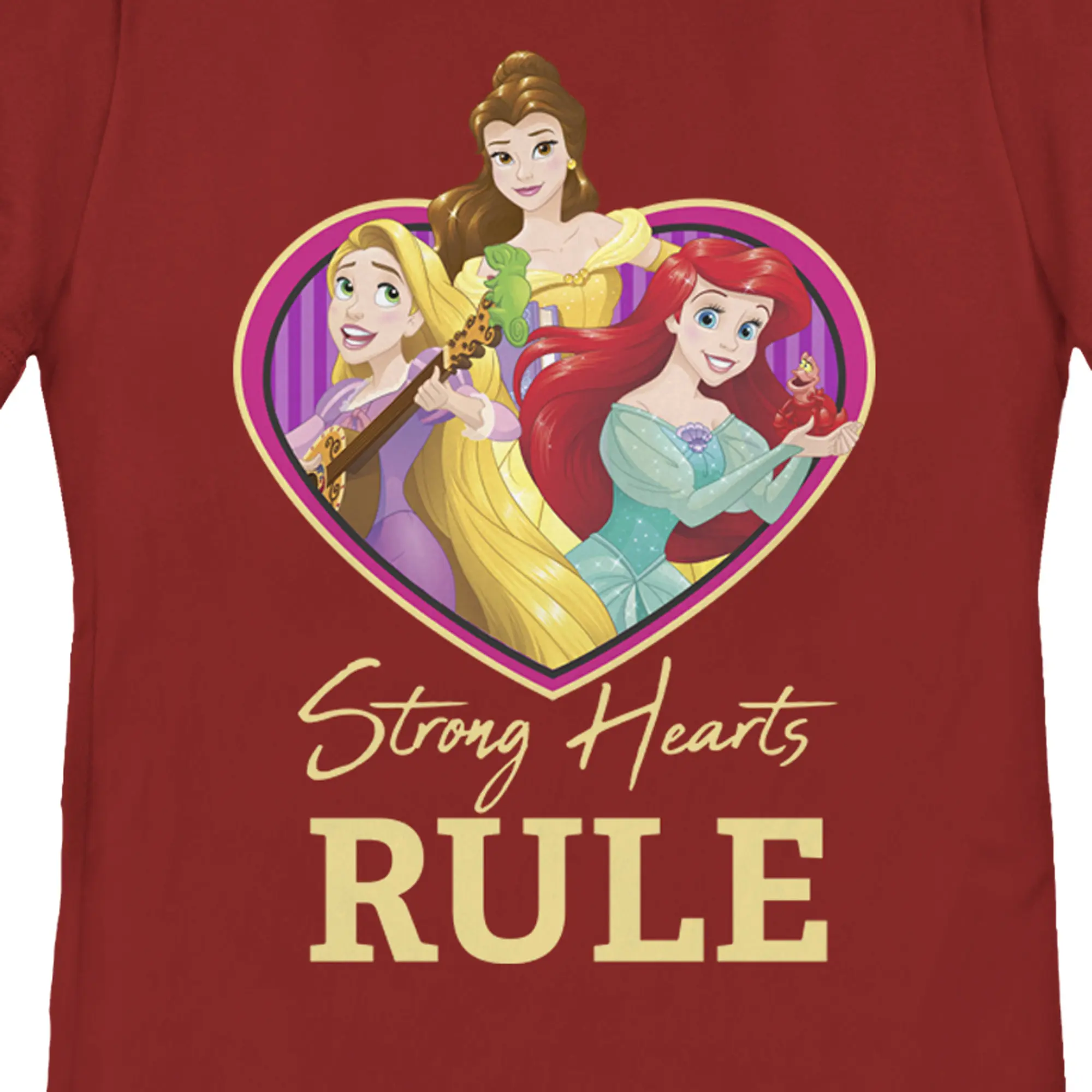 Strut your stuff with this stylish new Valentine's Day women's t-shirt that is perfect for your sweet valentine! Featuring Ariel, Belle, Rapunzel, Pascal, and Sebastian in a heart along with "Strong Hearts Rule" printed below in yellow.