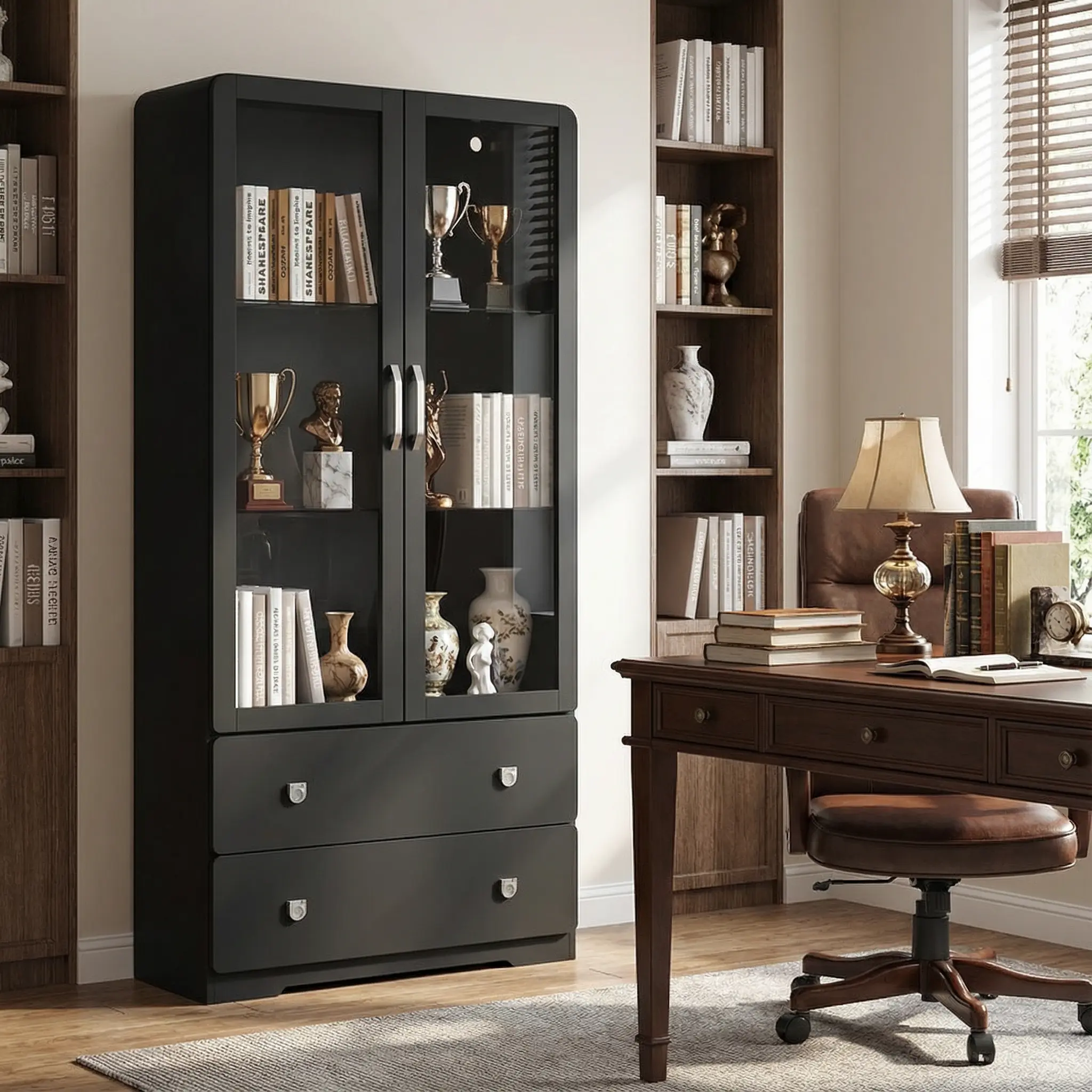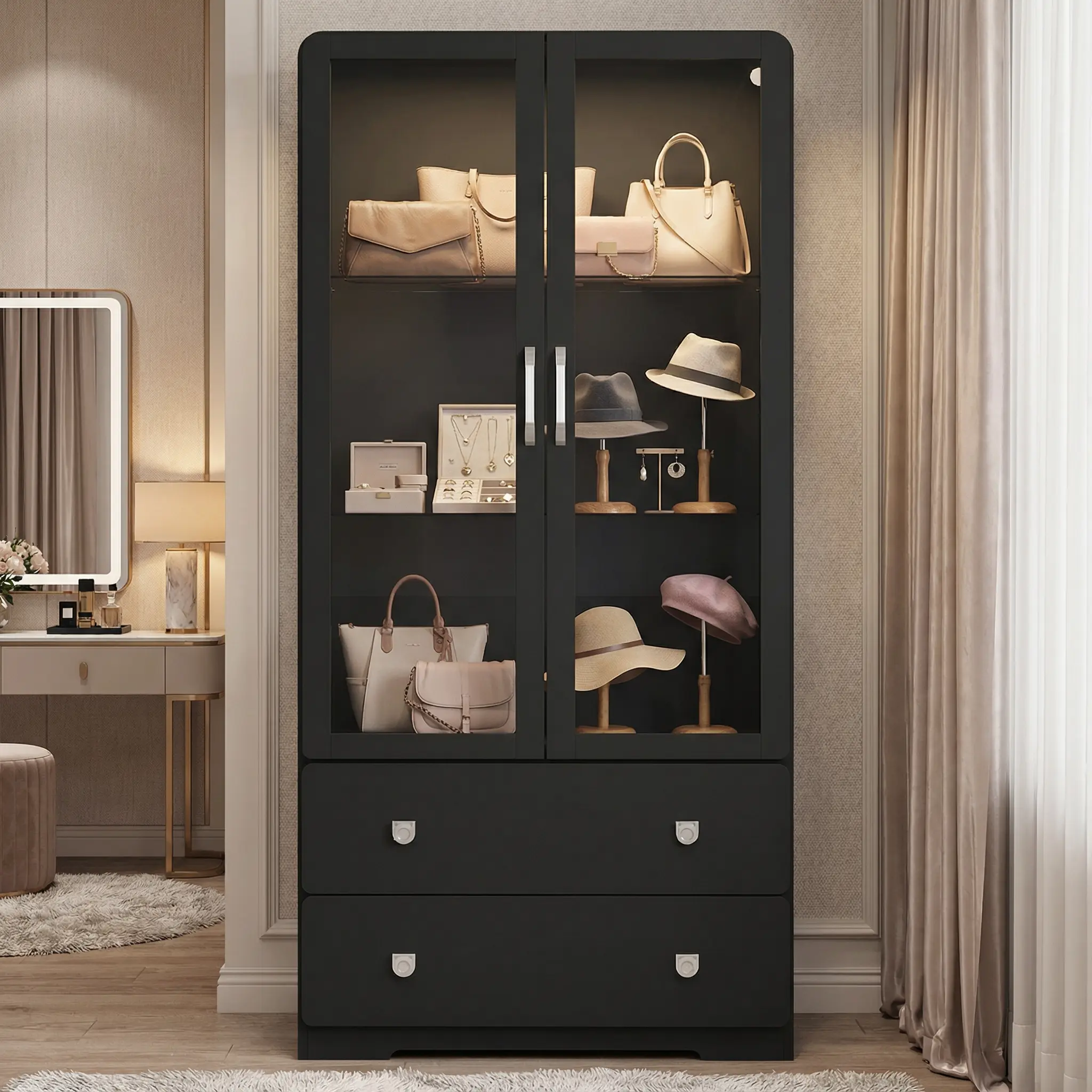 All-in-One Display & Storage: Measuring 29.53'' Ă 15.75'' Ă 63.78'', this storage cabinet combines stylish showcasing with practical storage. The upper section features 2 glass shelves with 3 adjustable heights, perfect for displaying figurines or collectibles. Below, two spacious drawers provide ample storage for accessories, small items, or everyday essentials, keeping your cabinet neat and organized.