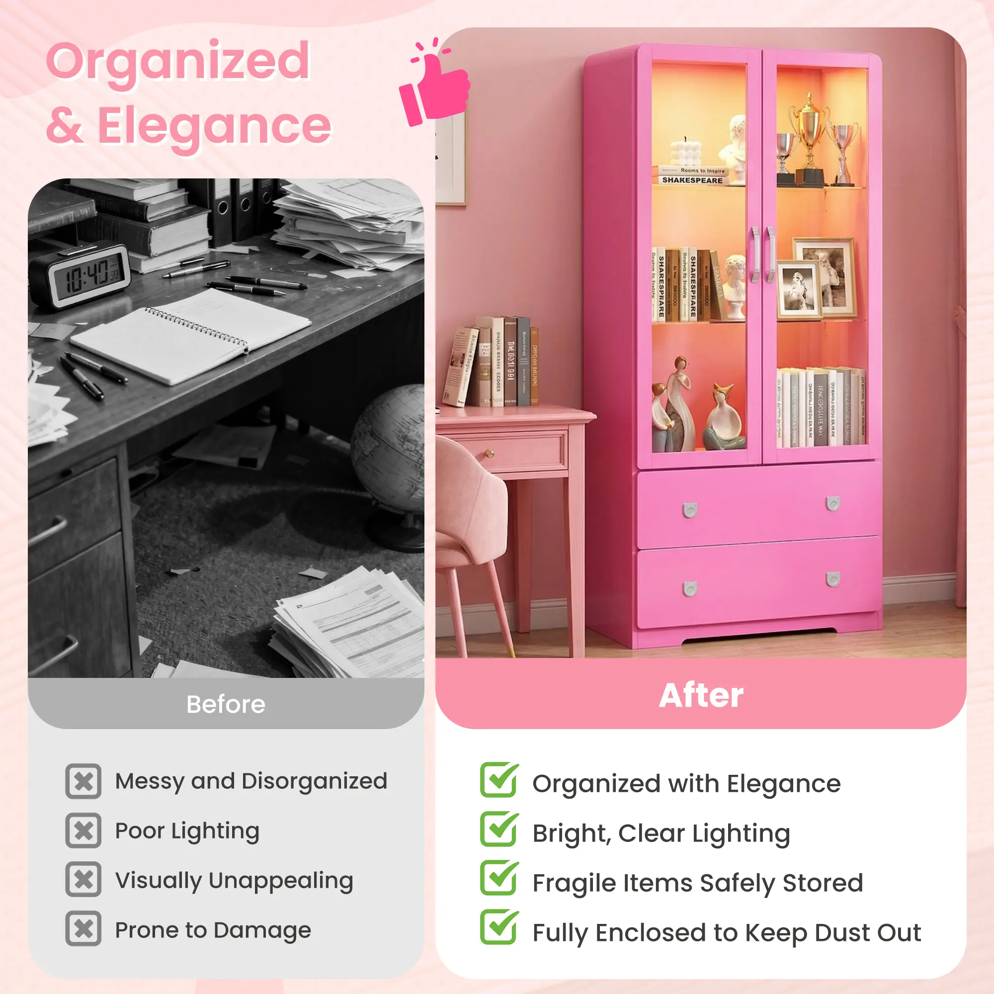 Showcase Your Collection in Style: Featuring high-transparency acrylic doors, this display cabinet puts every detail of your figurines and collectibles on full display. The fully enclosed design keeps dust out and reduces daily upkeep, offering extra protection for your treasures. Practical yet stylish, it keeps your space organized while adding a touch of eleganceâperfect for any room that deserves to shine.
