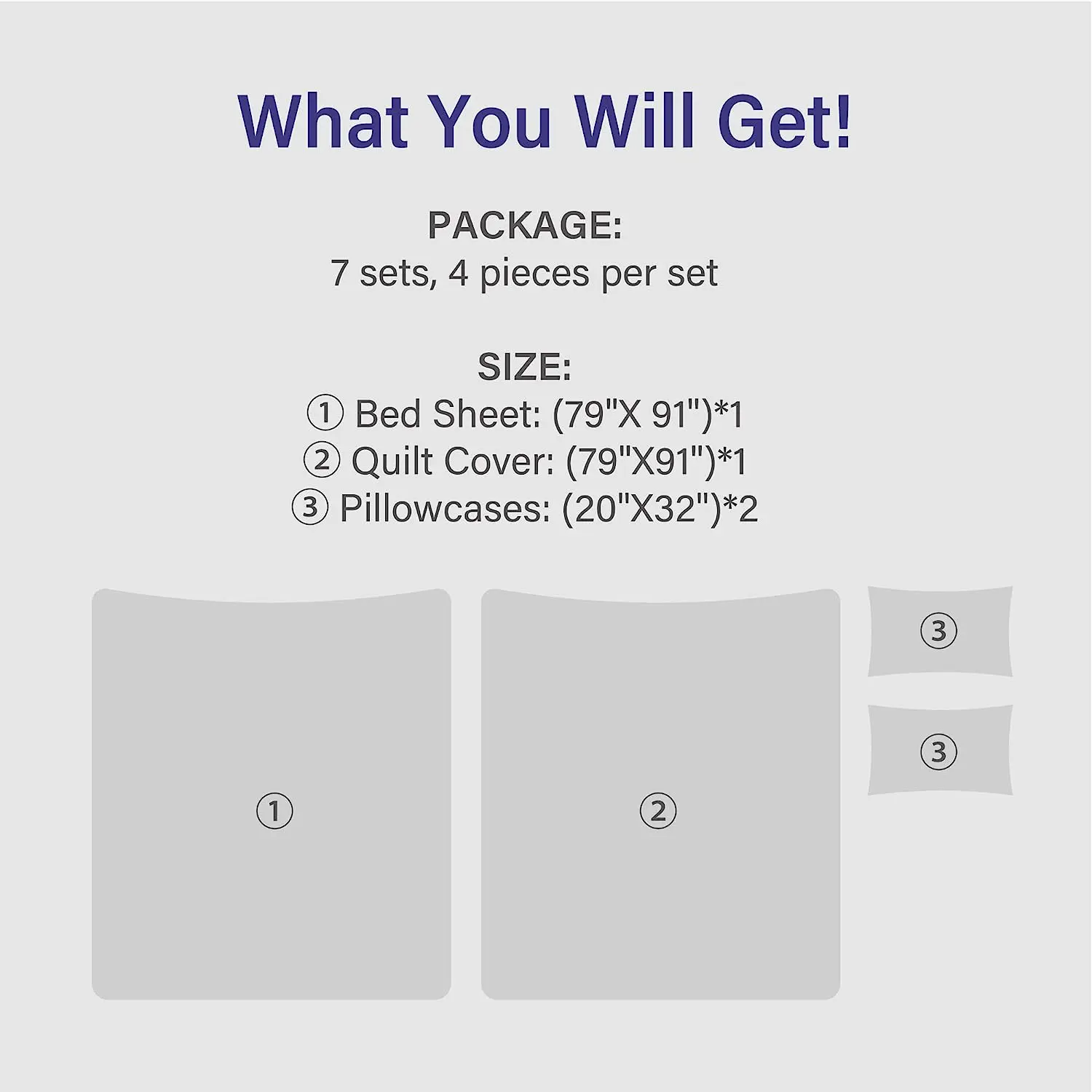 ·Size & Package:7 sets,4 pieces per set. Bed Sheet-(79"X 91")X1, Quilt Cover- (79"X91")X1, Pillowcases-(20"X32")X2