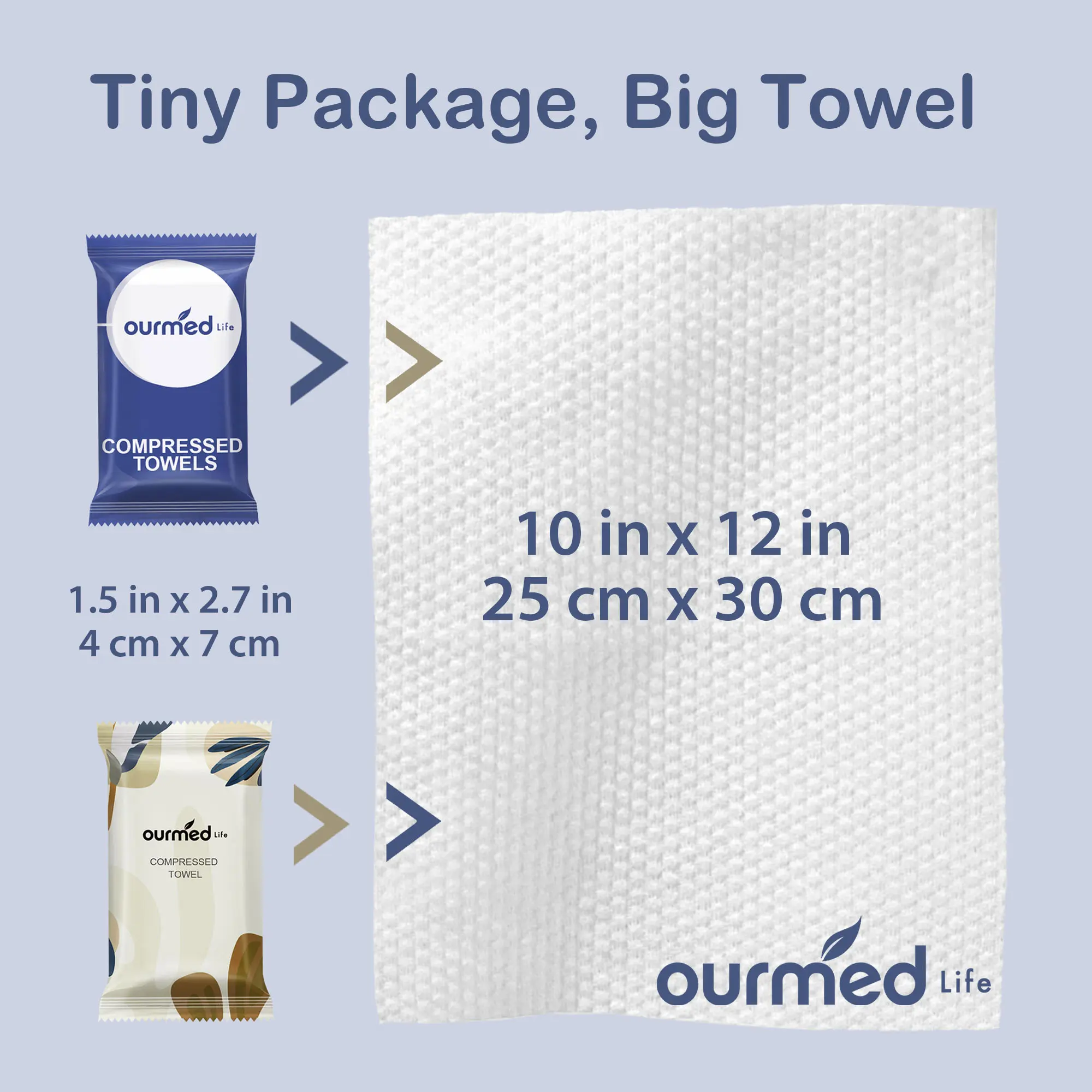 Ourmed Life compressed towels are ideal for hiking, camping, sports, road trips, flights, festivals, or emergencies. Lightweight, disposable, and ready whenever you need a fresh towel. These towels ensure you're prepared for any outdoor adventure with their compact size and easy portability.