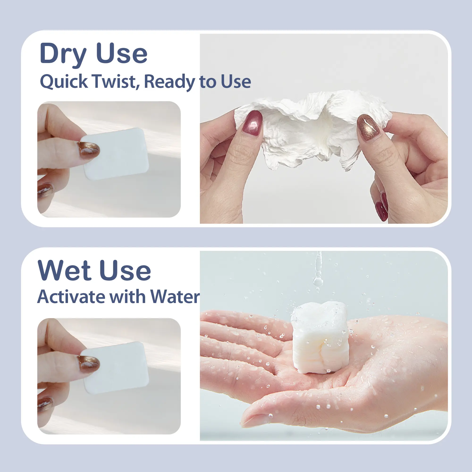 Open dry by hand or activate with water to a full 12x10 inch towel. Soft, durable, lint-free compressed towels in individual wraps deliver clean, single-use convenience and neat, sealed storage. Enjoy the flexibility of using them dry or wet.