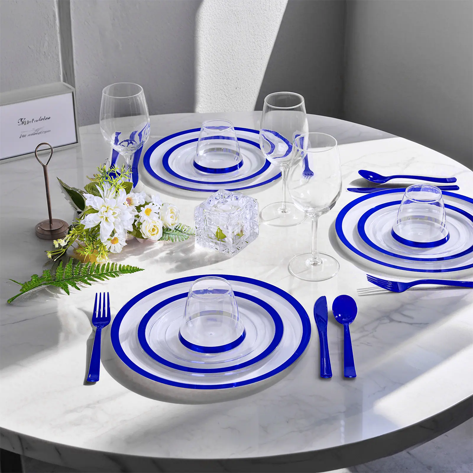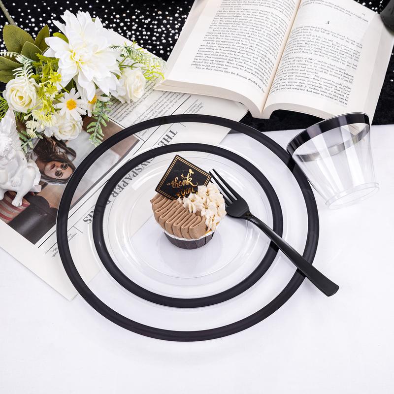 350 Clear Black: Plastic Plates Disposable for 25 Guests Include: 50 Dinner and 50 Dessert Plates,50 Plastic Cups,50 Per Rolled Napkins with Cutlery for Party,Wedding