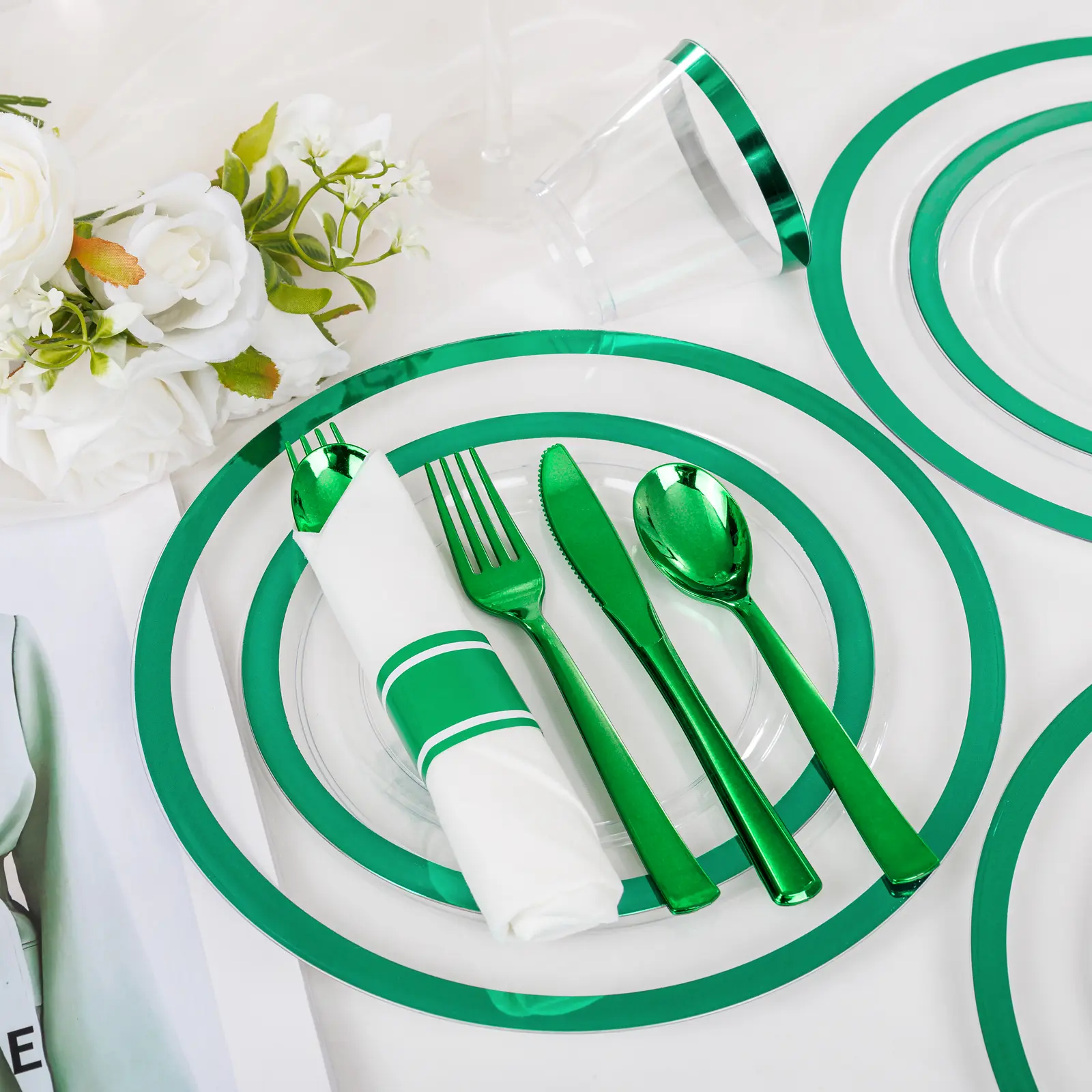 350 Green:Plastic Plates Disposable for 25 Guests Include:100 Dinner and Dessert Plates,50 Plastic Cups 9 OZ,50 Per Rolled Napkins with Cutlery