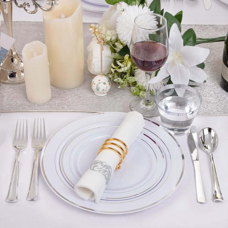 350Silver:Plastic Plates Disposable for 25 Guests Include:100 Silver Rim Plates, 50 Paper Napkins, 50 Cups, 50 Plastic Silverware Set Perfect for Party & Wedding