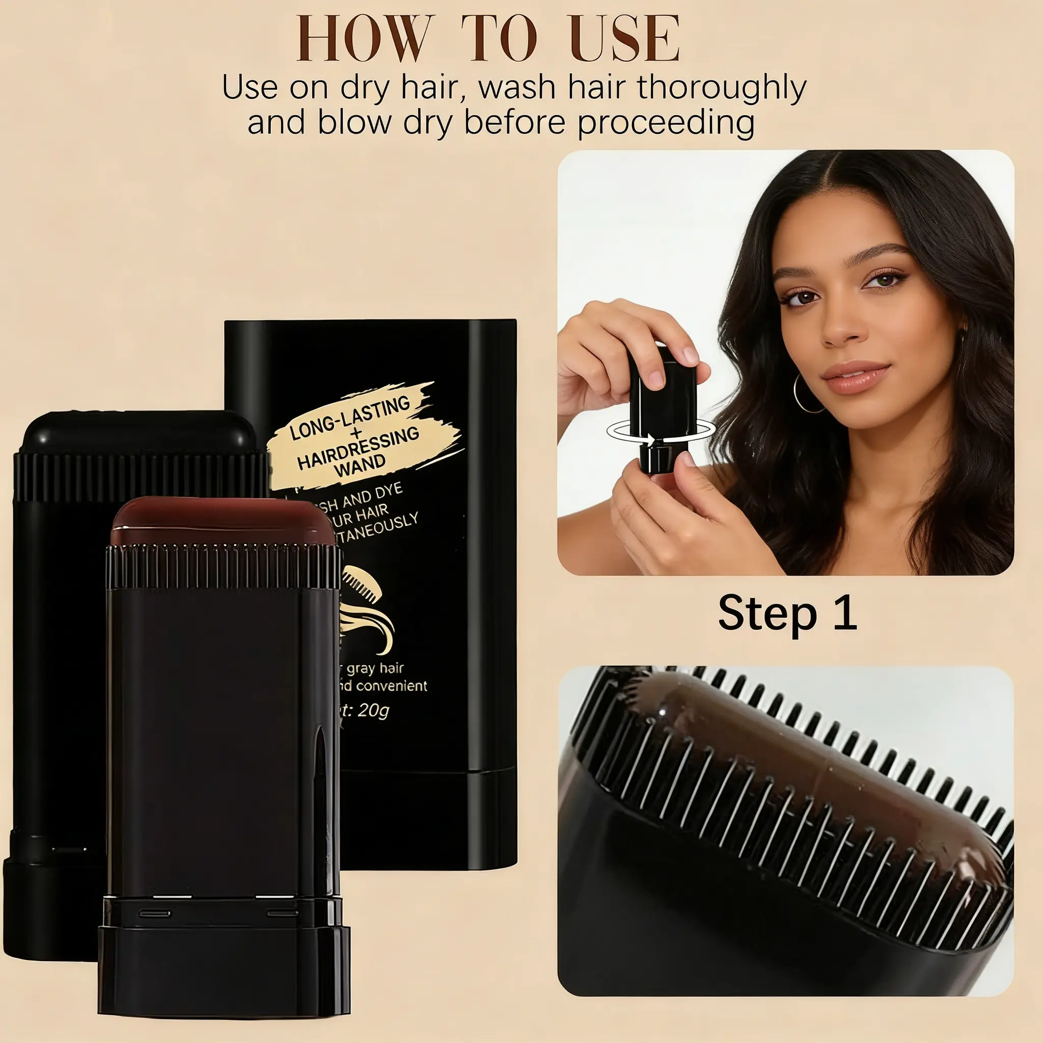 ·Wash your hair first and blow dry it thoroughly before use. Then open the lid and twist it clockwise to unscrew the paste. Unscrew the paste to the half position of the comb teeth, pull up the hair, and apply a small amount directly to the desired area multiple times, combing the hair while dyeing.