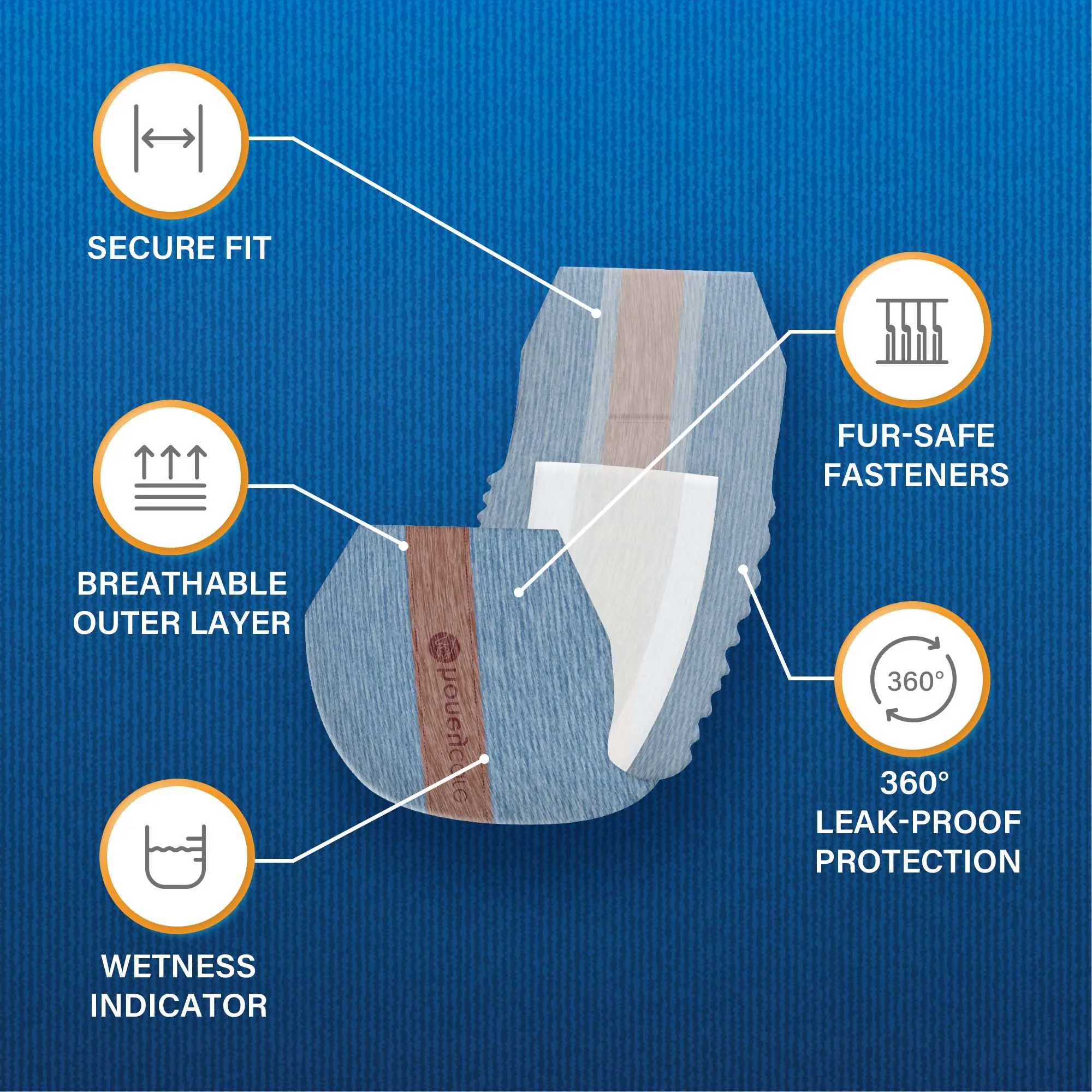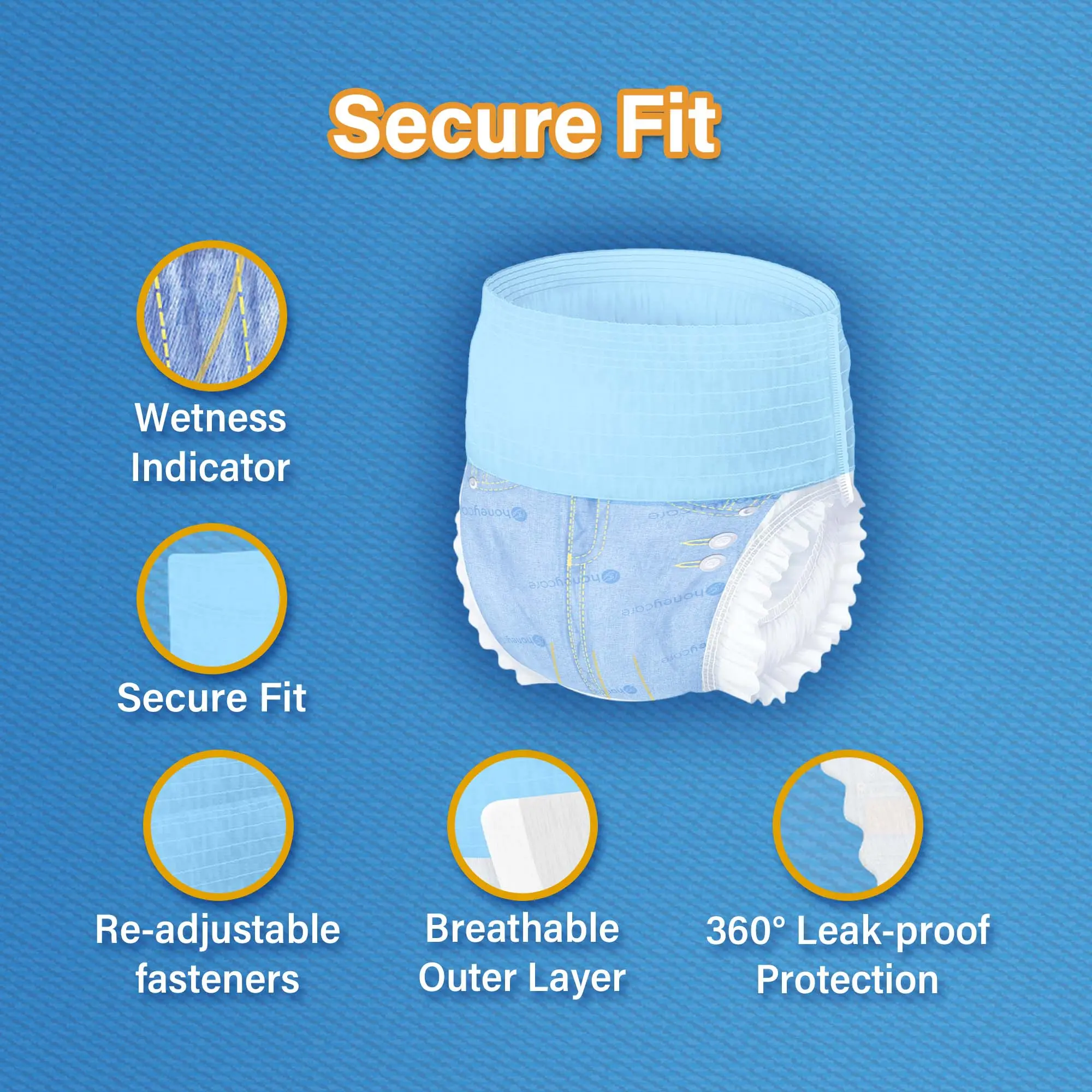 Key Advantages: 1. Breathable Outer Layer: Summer-friendly comfort, prevents rashes. 2. 360° Leak Protection: Absorbent core + leak barrier keeps sofas and floors dry. 3. Non-Stick Velcro: Adjustable closure, gentle on skin during changes. 4. Stretch Fabric: Bounces without waistband digging in, unrestricted movement. 5. Wetness Indicator: Changes color when wet—easy to spot when it's time for a change.