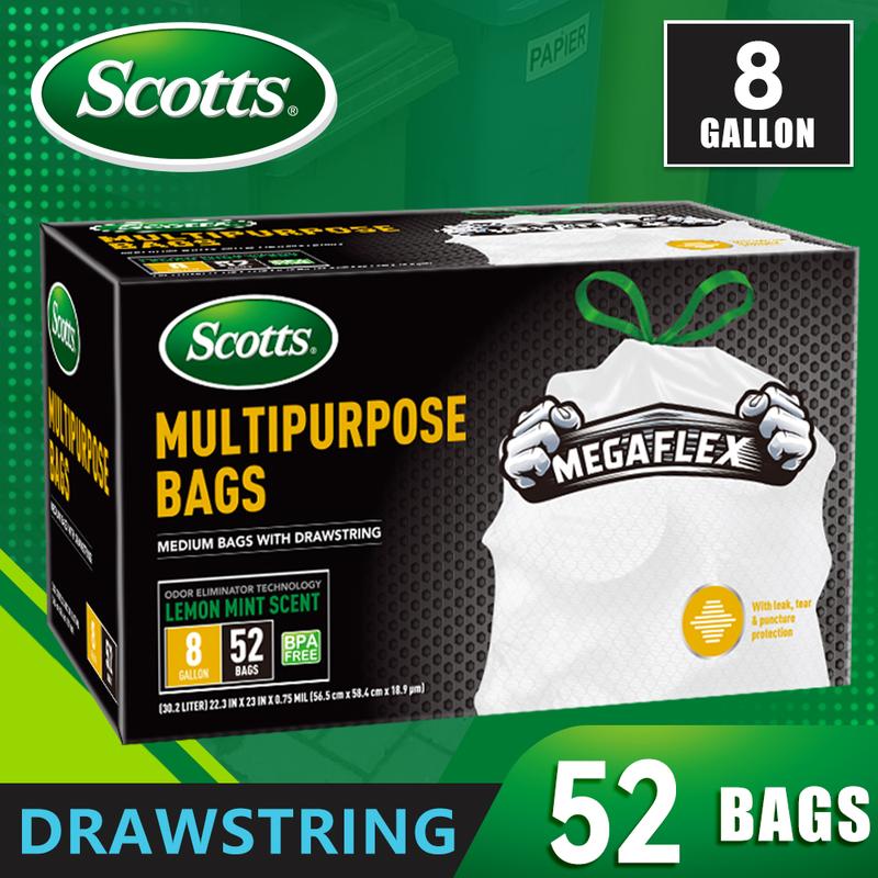 Scotts 52 Bags 8 Gallon Boxed Disposable Non Tear Puncture Tear Resistant Trash Bags, ODOR ELIMINATORTECHNOLOGY Kitchen, Toilet Drawstring Garbage Bags, Fresh Clean Scent With Lemon mint Scent, Multipurpose Easy To Usedrawstrings More Durable #bags #8 #gallon #drawstring #garbage