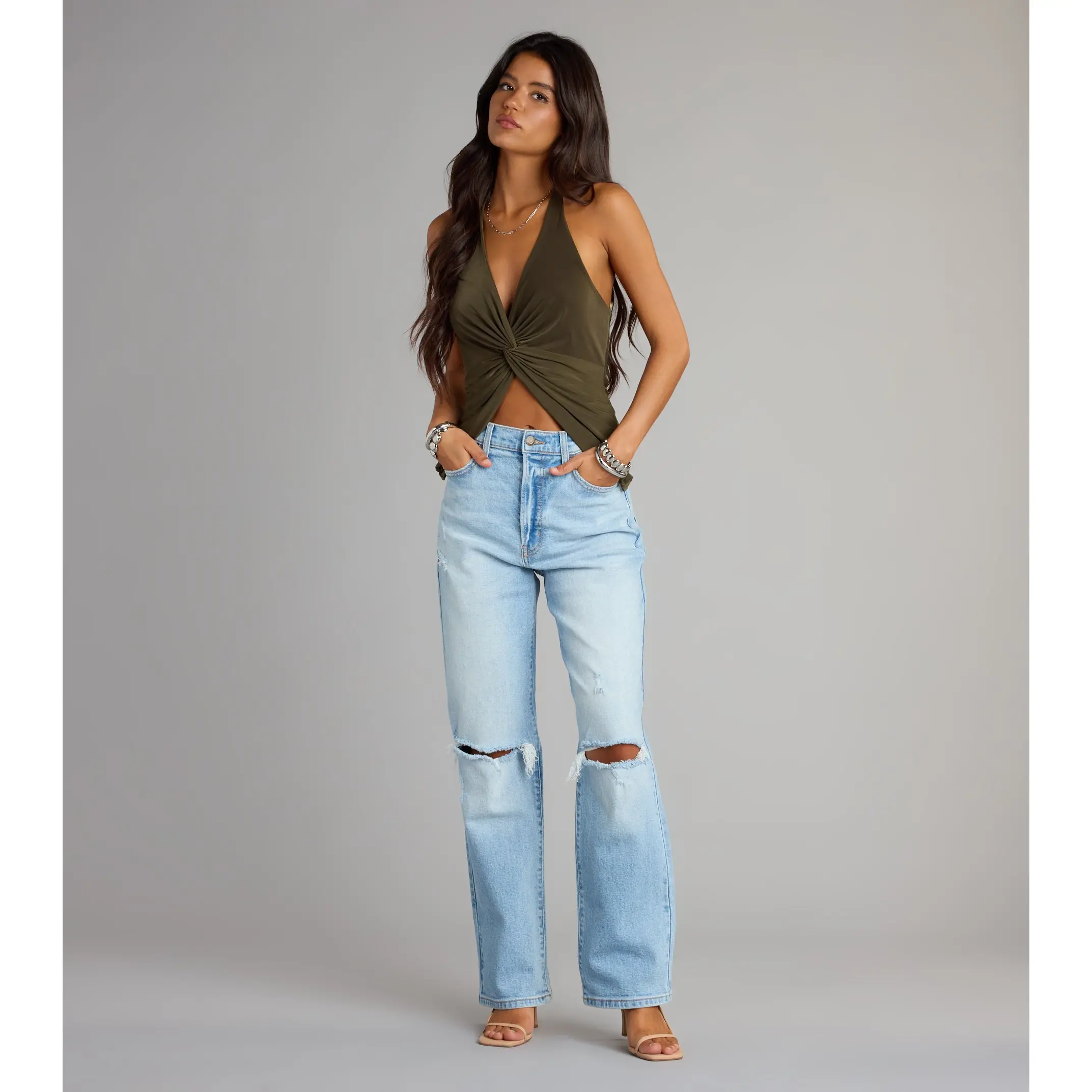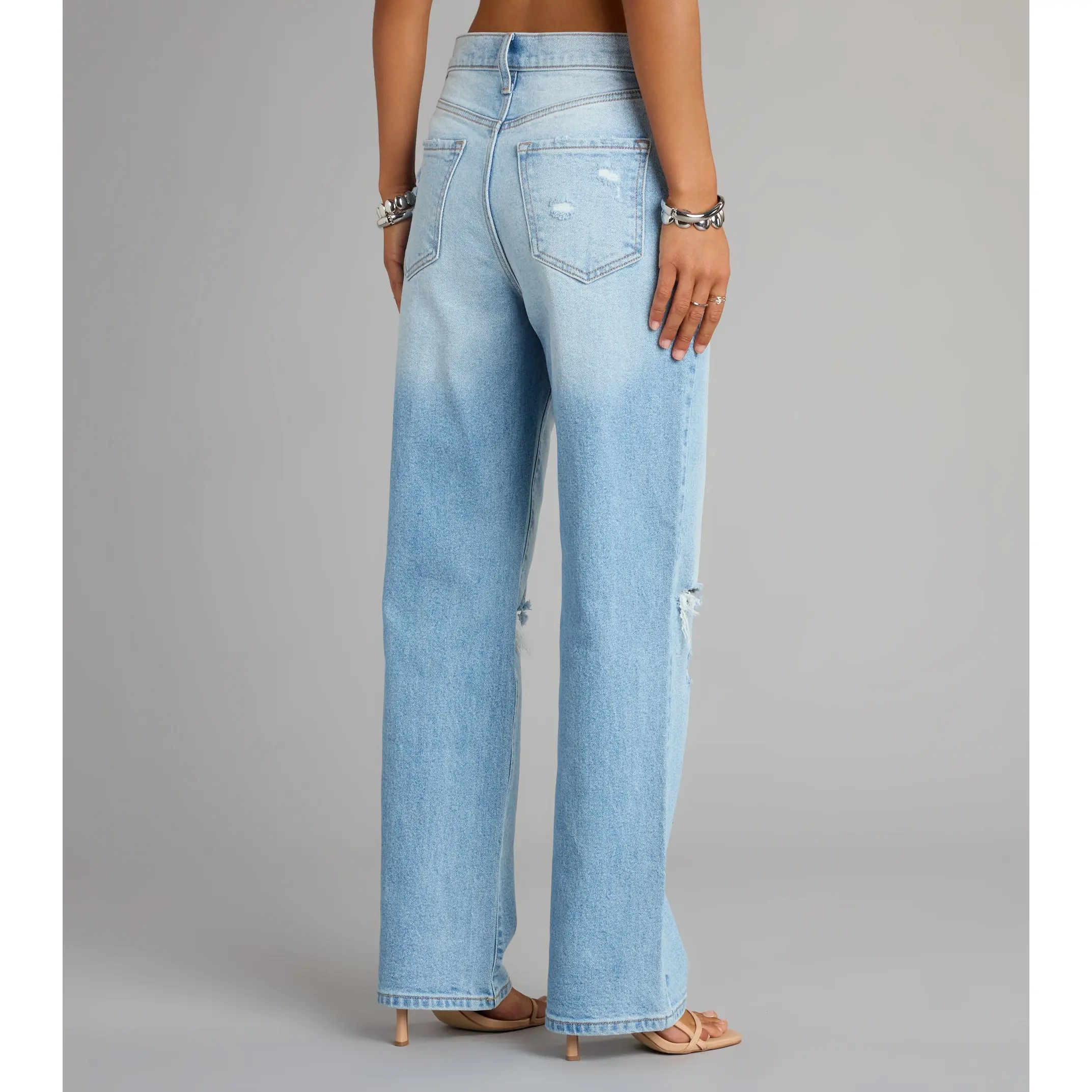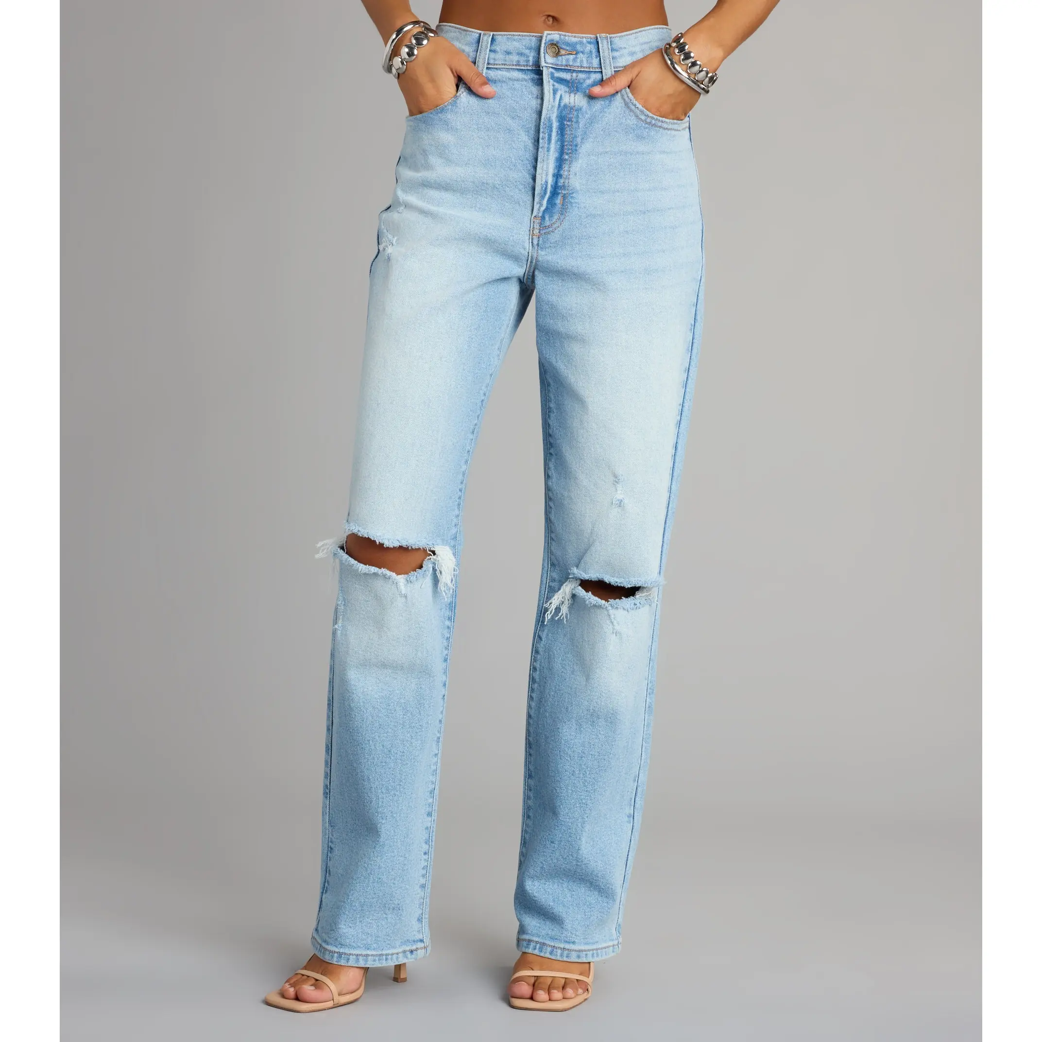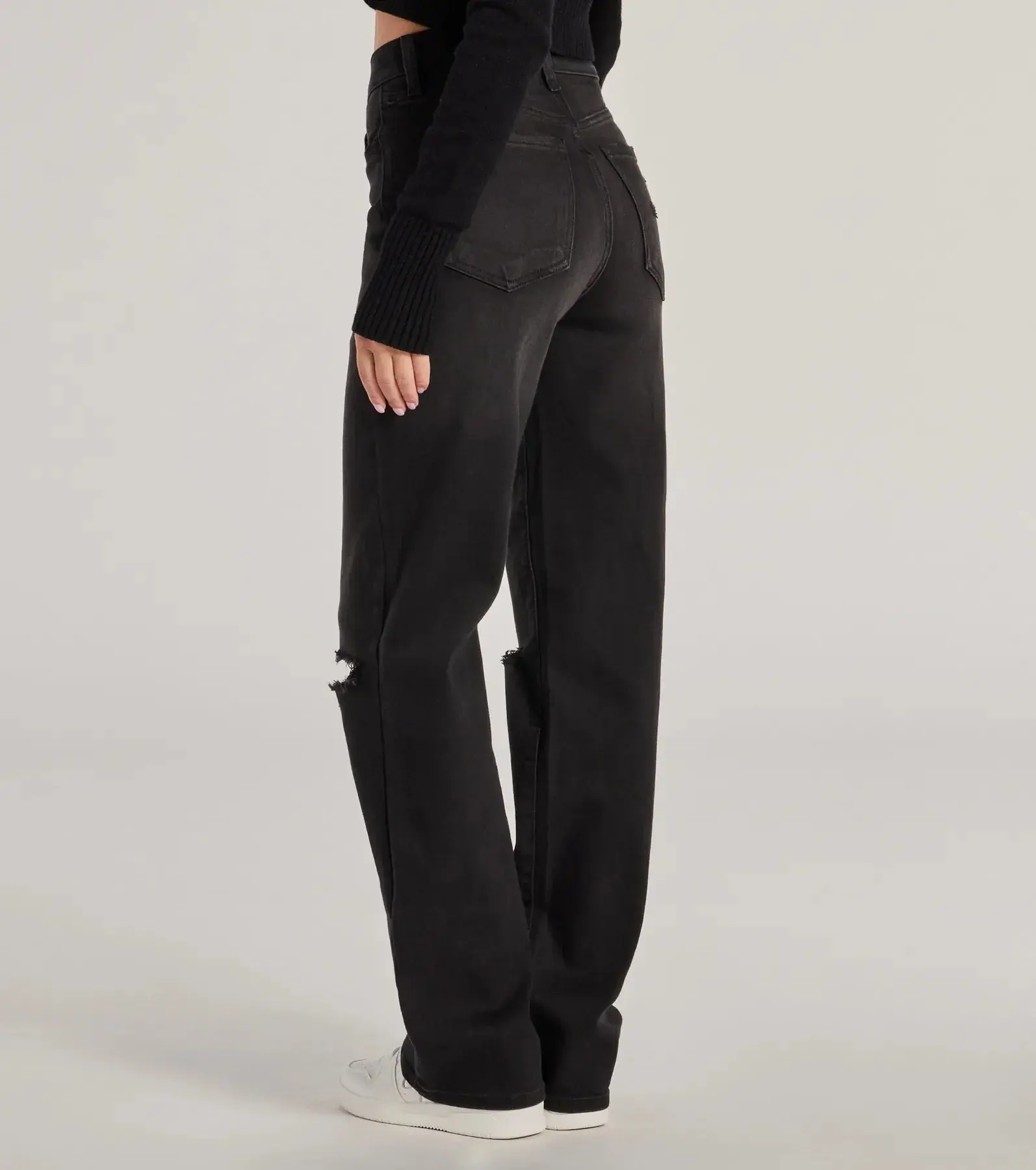 Create a dramatic moment with distressed jeans that add an edge to your look! The medium-wash denim jeans feature a flattering high-rise waist and a boyfriend silhouette with trendy knee slits. Complete the look with a crop top and combat boots.