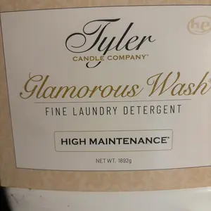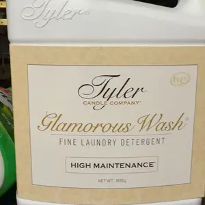 Does not smell as strong as the Tyler detergent. Appears they might have added water. The color is lighter. There was a piece of tape over the lid and a lot of the detergent leaked out of the bottle and into the box.