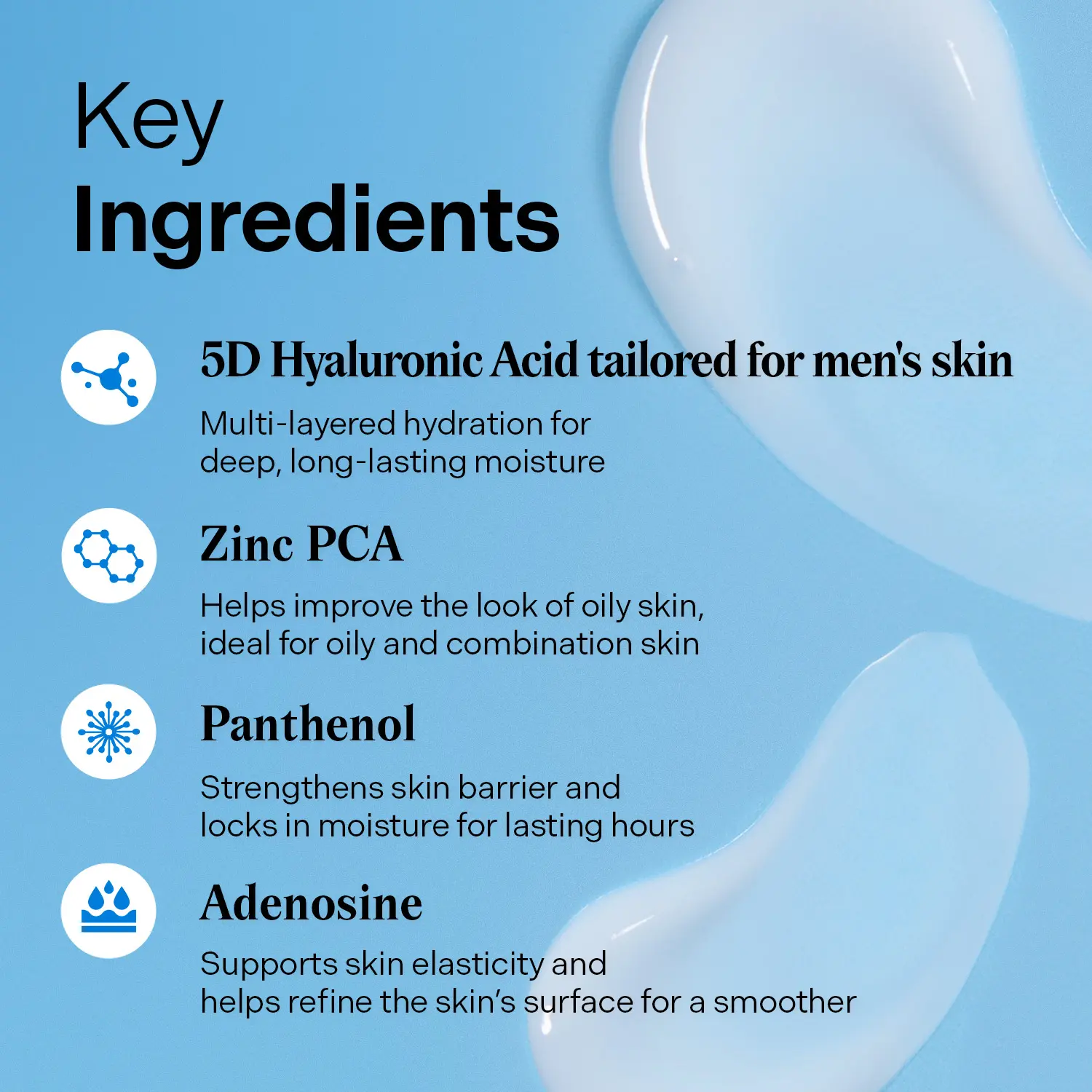 Targets inner dryness in men’s skin with five sizes of Hyaluronic acid molecules, enhanced with low molecular weights for deep, long-lasting hydration from within