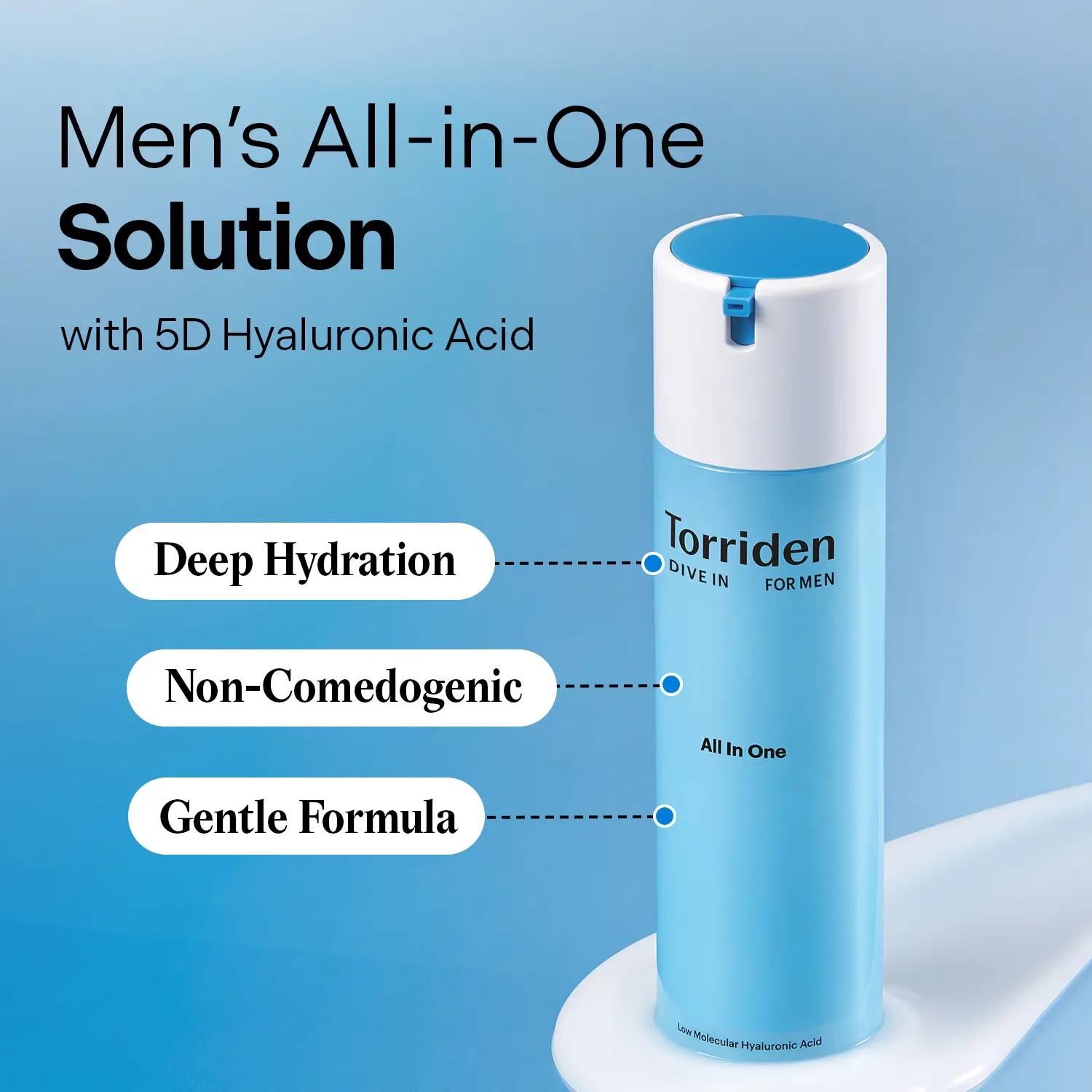 All in one moisturizer provides deep hydration with 5D multi low-molecular Hyaluronic acid and peptide. Contains low-molecular, reinforced 5D Hyaluronic acid that provides intensive care and deep moisturization for combination men's skin.