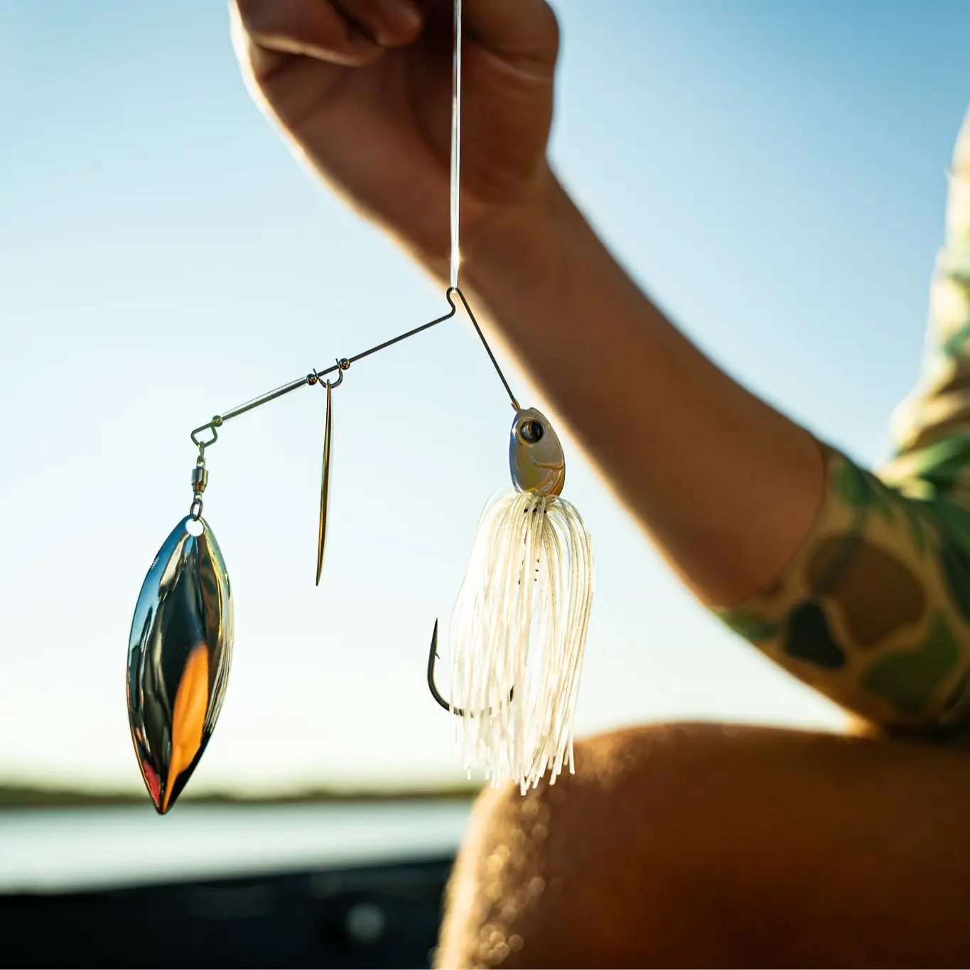 Strength, vibration, and balance. The Divine Spinnerbait is designed to outperform, outlast, and out fish, any spinnerbait on the market. Built with the highest quality heat-treated stainless-steel spring wire, the Divine Spinnerbait is made for strength without sacrificing the vibration you need to attract fish. The countless testing of wire angle, blade size, and head shape, bring you the most compact, balanced, horizontal swimming, and ultra-vibration spinnerbait yet. No stone was left unturned in the design of the Divine Spinnerbait, featuring a 3D head design, screw-lock bait keeper, custom painted head, a hand-tied skirt, premium blades, and unmatched components. The 6th Sense Lure Lab is proud to bring you the new Divine Spinnerbait.