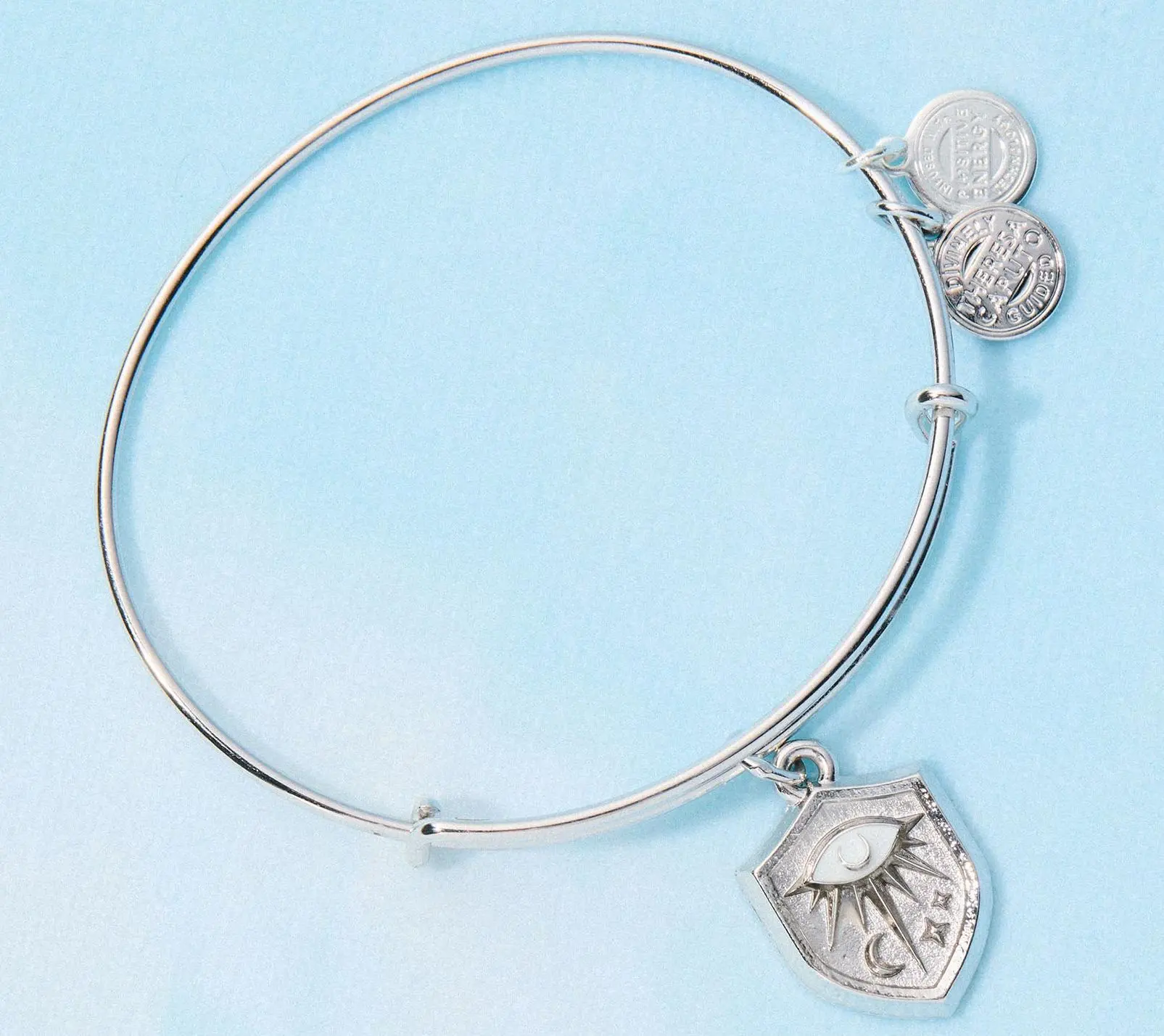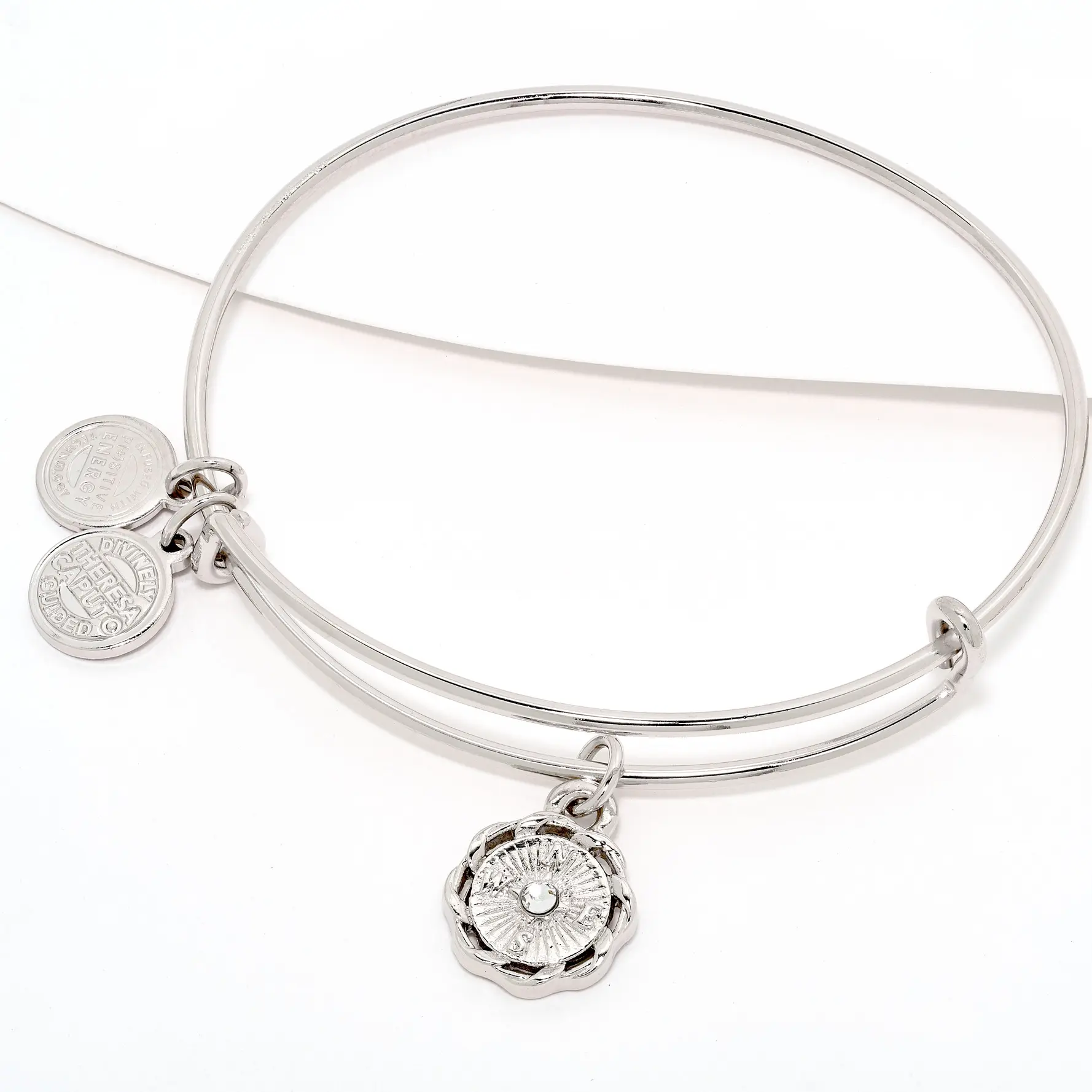 &LIVY's Divinely Guided by TLC's Long Island Theresa Caputo Universal Expandable Fit bracelet - One size Pull apart to expand, push together to tighten Expandable Wire Bangle with Charim 7 3/8"L x 2 9/16" x 2 1/4" Polished Silvertone w/ White Epoxy Boxed with Romance Card Imported