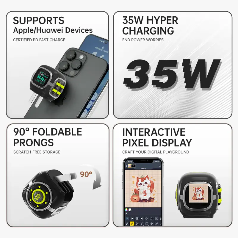 Ever wish your charger could be as fun as it is functional? Meet the Divoom Dipow 35W USB-C charger—a compact powerhouse that charges your devices fast and keeps things cool thanks to advanced GaN technology. Whether you're powering up your iPhone 16, MacBook Air 15, iPad, or Galaxy S23/S24, this charger delivers efficient 35W output with 95% energy conversion to reduce heat and save energy. But here’s the twist: its DIY pixel display lets you customize your charger with pixel art and dynamic clock dials via Bluetooth and the DIVOOM app. It's like having a mini digital canvas on your power adapter! Plus, the foldable plug design means it’s travel-friendly and easy to stash in your bag. The one-touch screen off feature is perfect for nighttime charging without glowing distractions. Inside the box, you’ll find the charger itself and a user manual to get you started. Ready to power up your devices with style and smarts? Grab the Divoom Dipow and add a splash of personality to your charging routine!