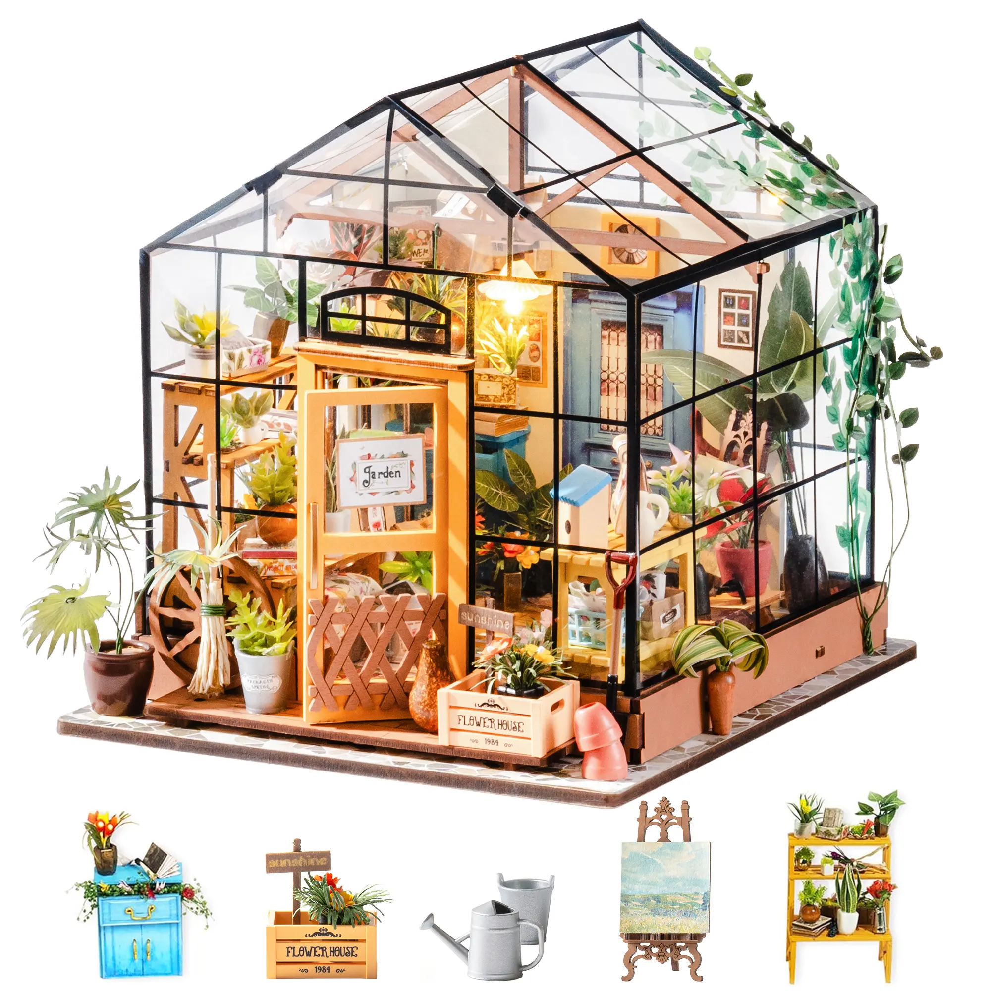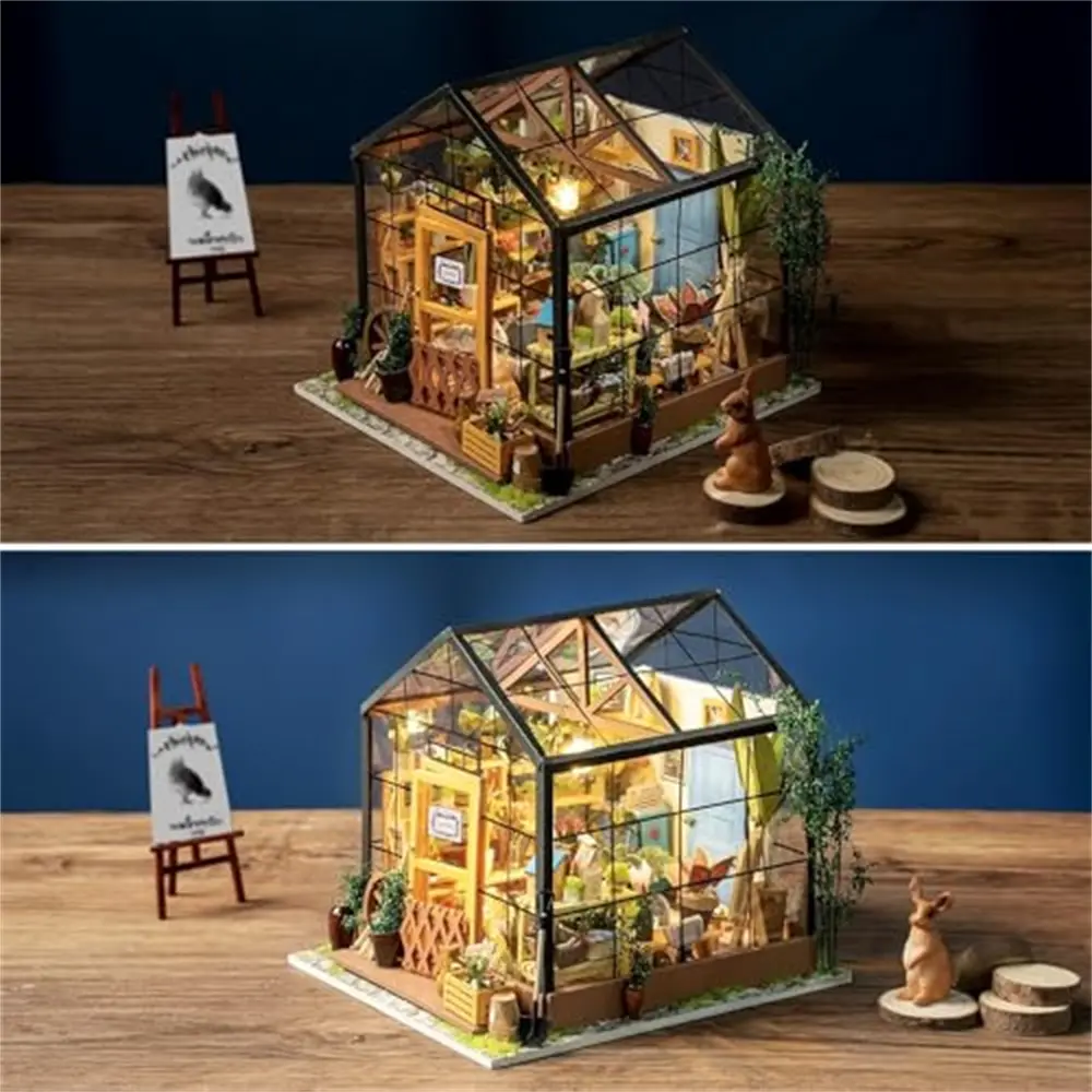 ·【Exquisite Mini House】Our diy doll house is very well made, using a miniature scale of about 1:24. A great little replica Green House with LED Light. Put it in the dark, it will bright miniature house. Safe, Non-toxic, highest quality material.