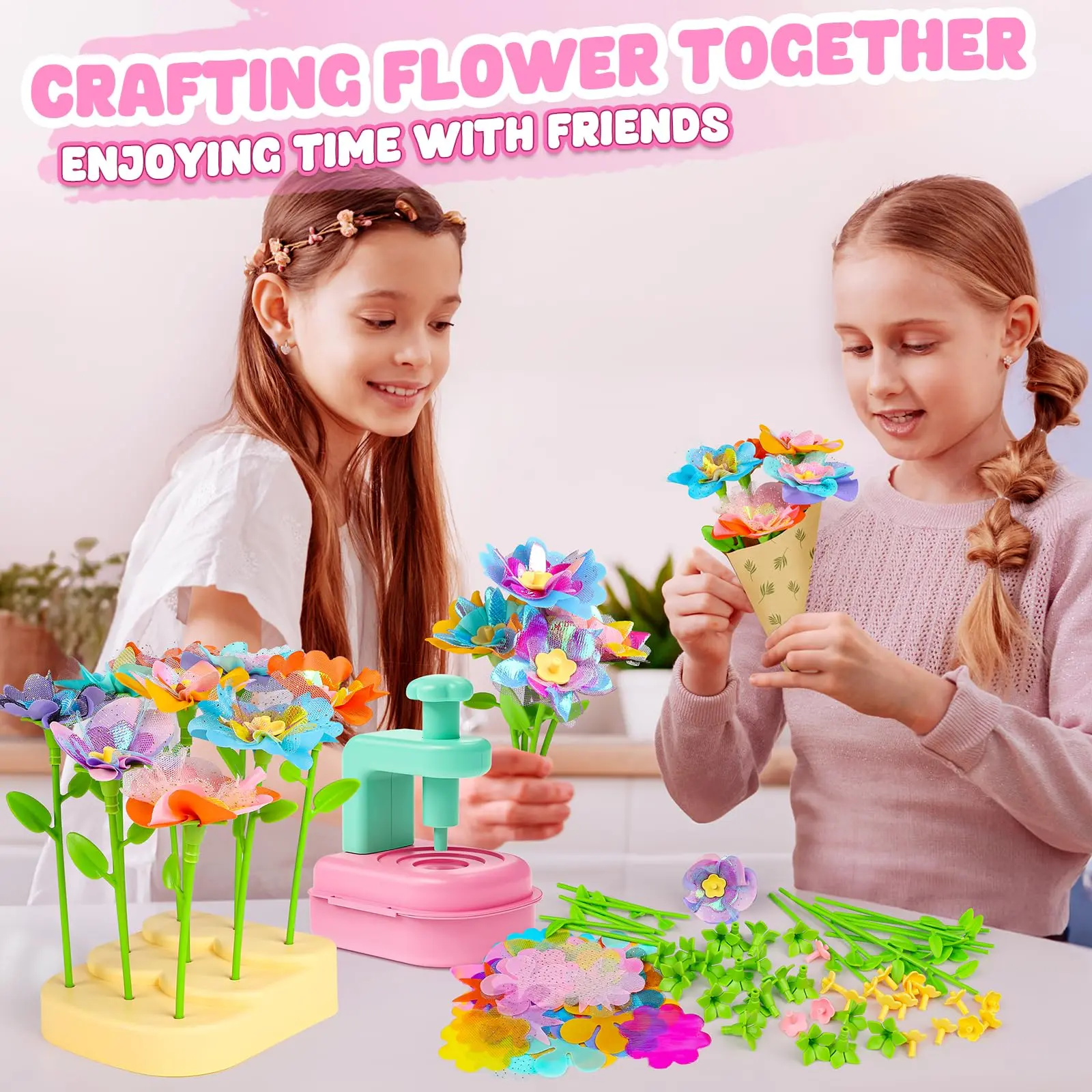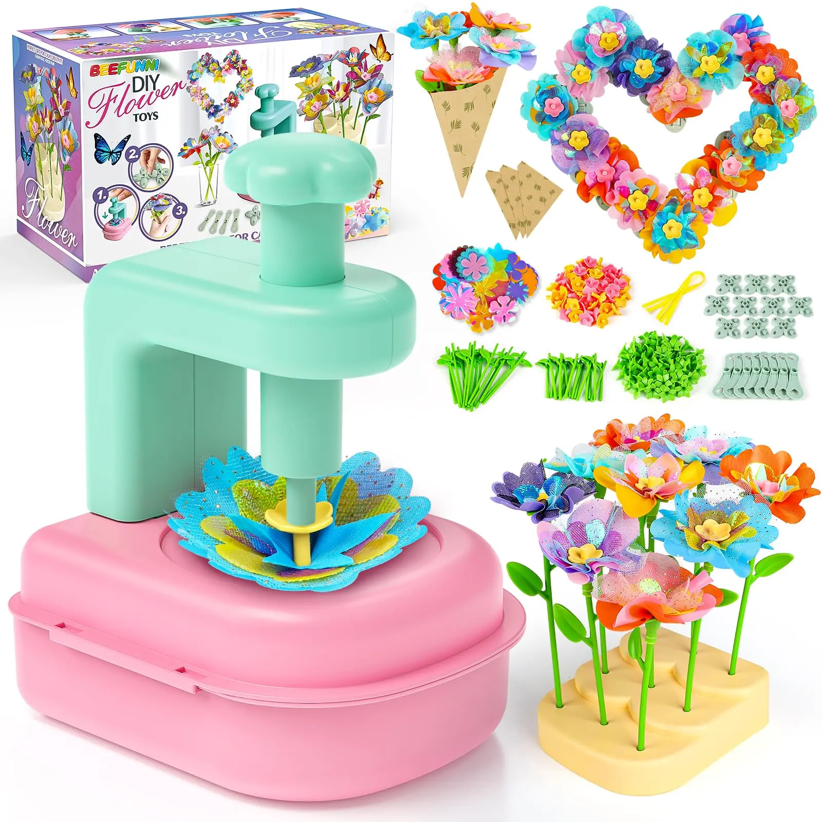 Flower craft sets come with an easy-to-use assembly tool, a wide range of colorful petals, flower centers, receptacles, long and short stems, a sturdy base, and bouquet wrapping paper. Fun awaits for little artists aged 3 to 10 or craft-loving parents. 🎨