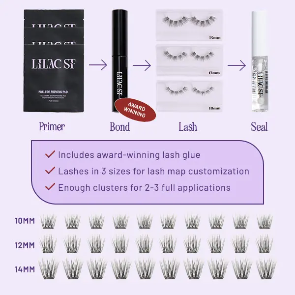 Meet the ultra-longwear DIY lash extension system. Includes everything you need for your cluster lash application: our best-selling longest-wear, quick-drying lash bond (Cosmo’s Favorite, 10,000+ sold every month), 30 fluffy, lifelike lash clusters in 3 sizes, and our signature sealant. Enjoy lifelike, water-proof, and salon-quality lashes that last up to 10 days.