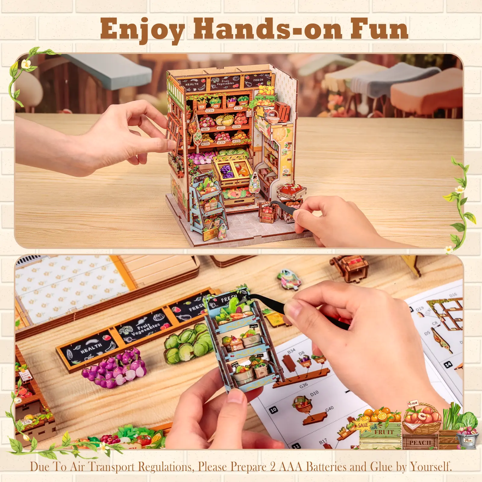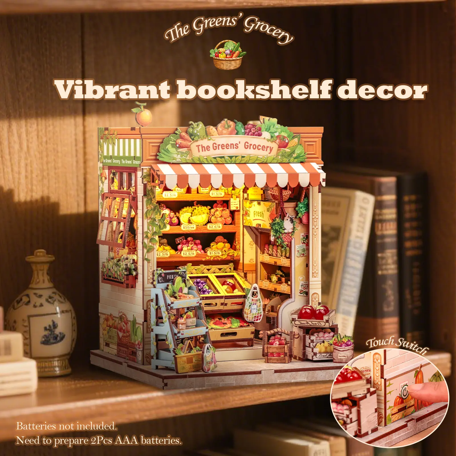 Reminder - The DIY book nook bookend kit for adults has been 100% carefully checked before delivery to ensure that the accessories are complete and not missing. If you have any questions during assembly, please feel free to contact us. We will solve any problems as soon as possible. Note: You need to prepare silicone liquid glue and two batteries (type AAA).