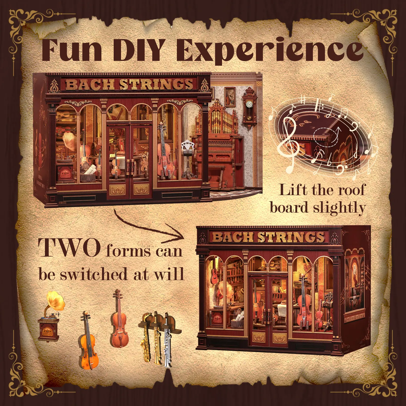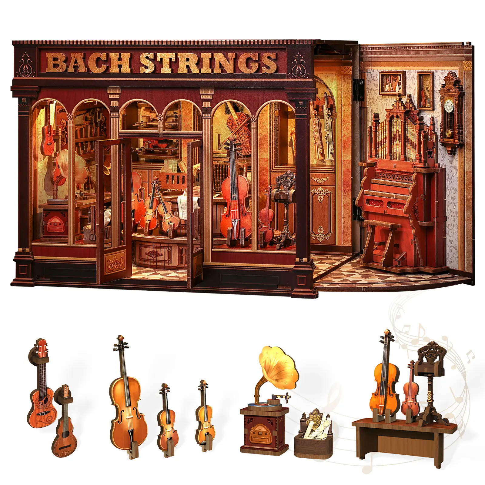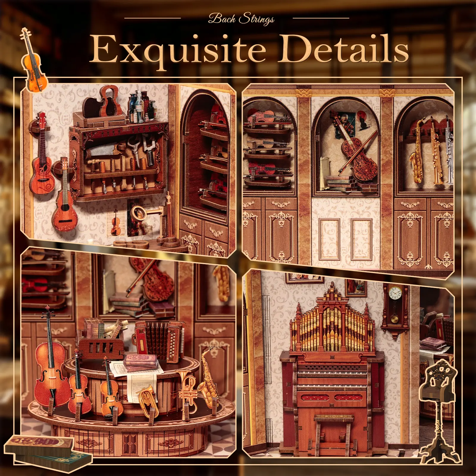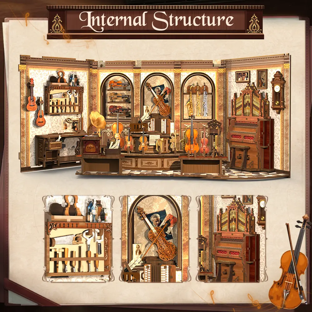This miniature house kit integrates history and culture, aesthetic pursuit, acoustic principles and functional needs, aiming to create a space that can perfectly display the charm of European classical music. It also incorporates elements of ancient Greek, Roman and Baroque styles. Open the door of this book nook, Immerse yourself in the classical music atmosphere and enjoy music creation and learning.