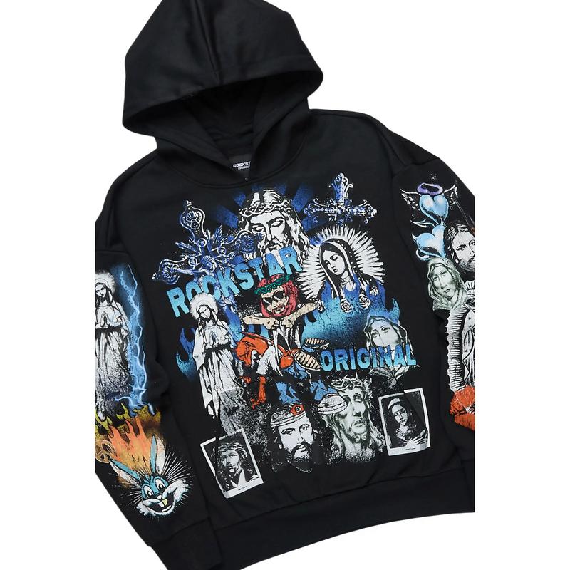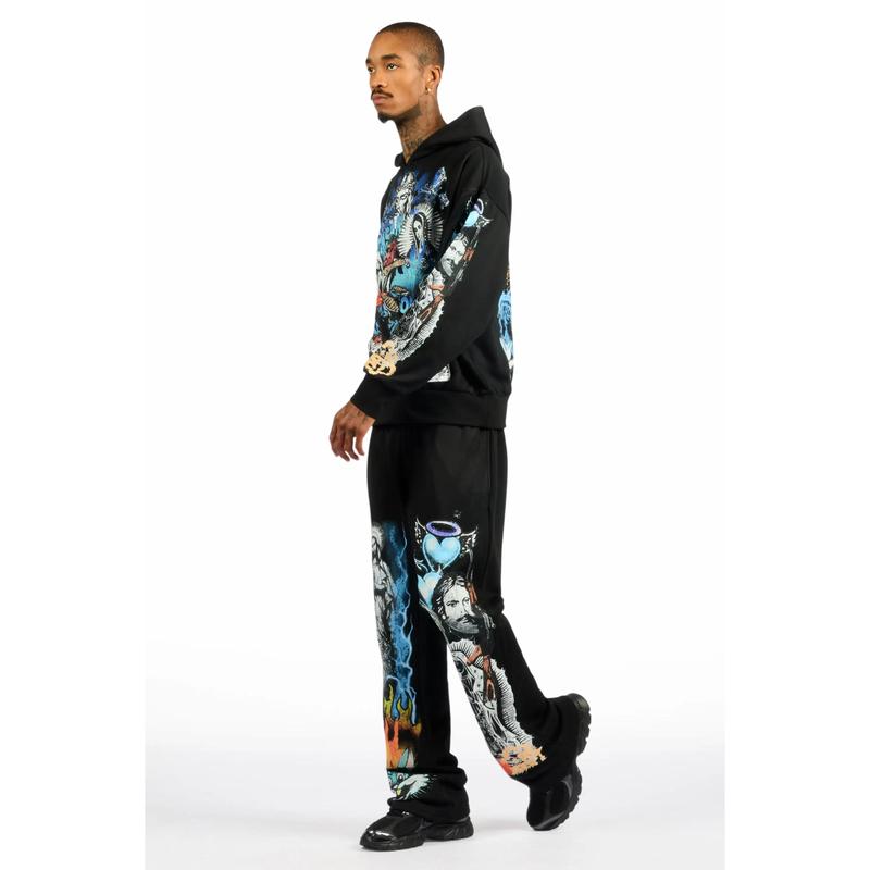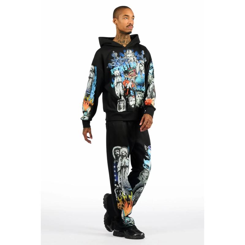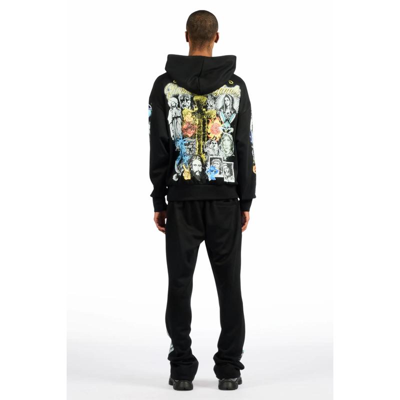 An urban two-piece hoodie and baggy pant set for men in black. Designed with organic cotton and custom detailing for a dope streetwear track set.