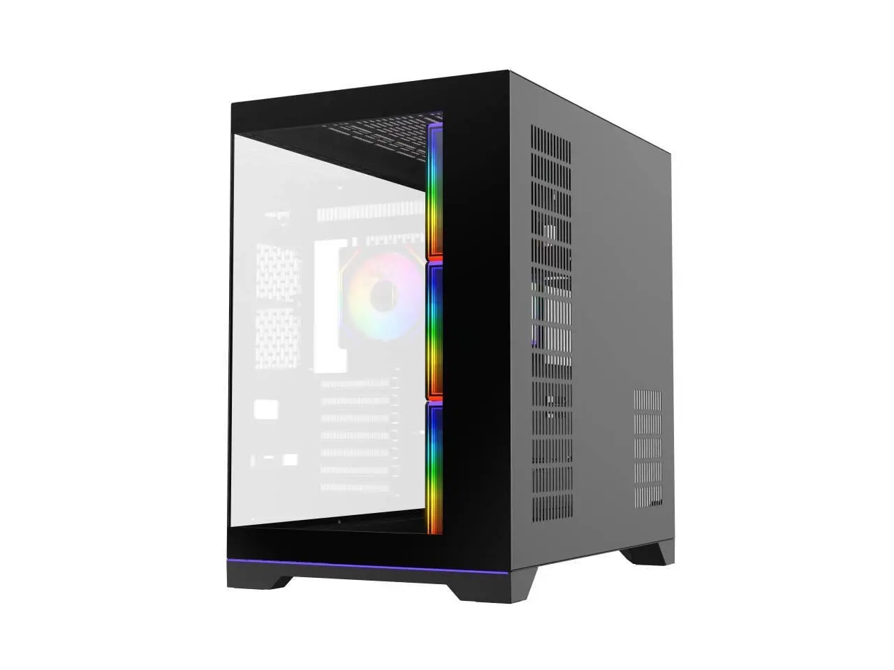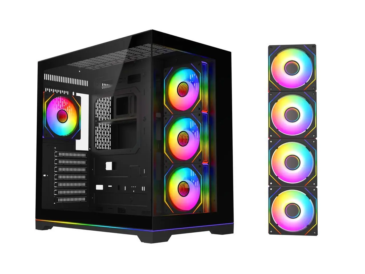 DIYPC ARGB-DC200-BK Black Dual USB3.0 Tempered Glass ATX Gaming Computer Case w/ 4 x ARGB PWM Fans (Pre-Installed) and ARGB Light Strip at Bottom.