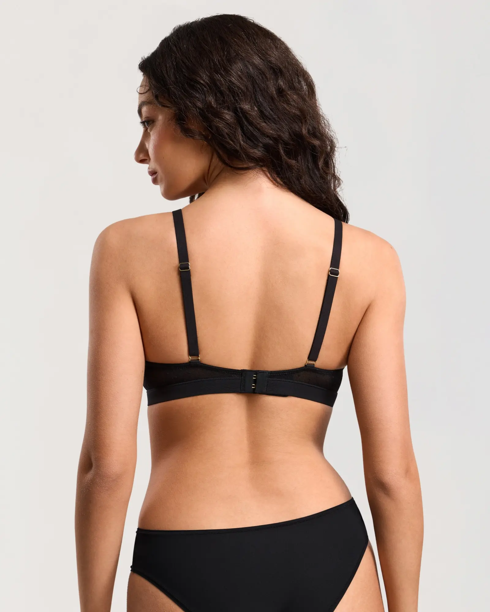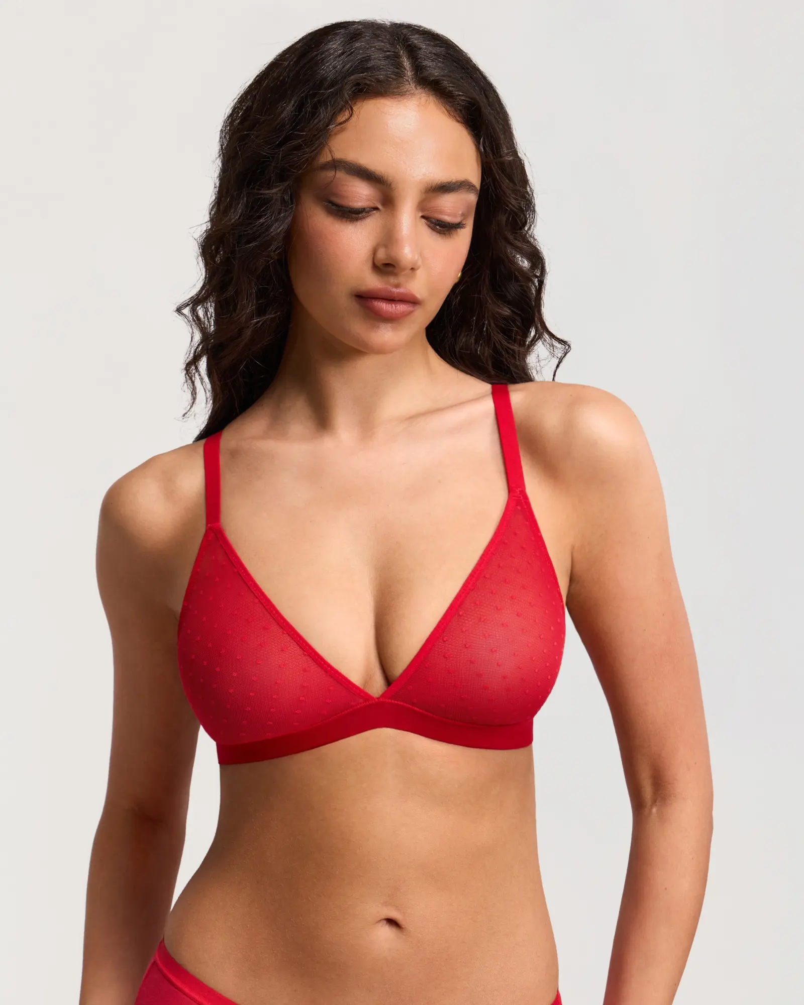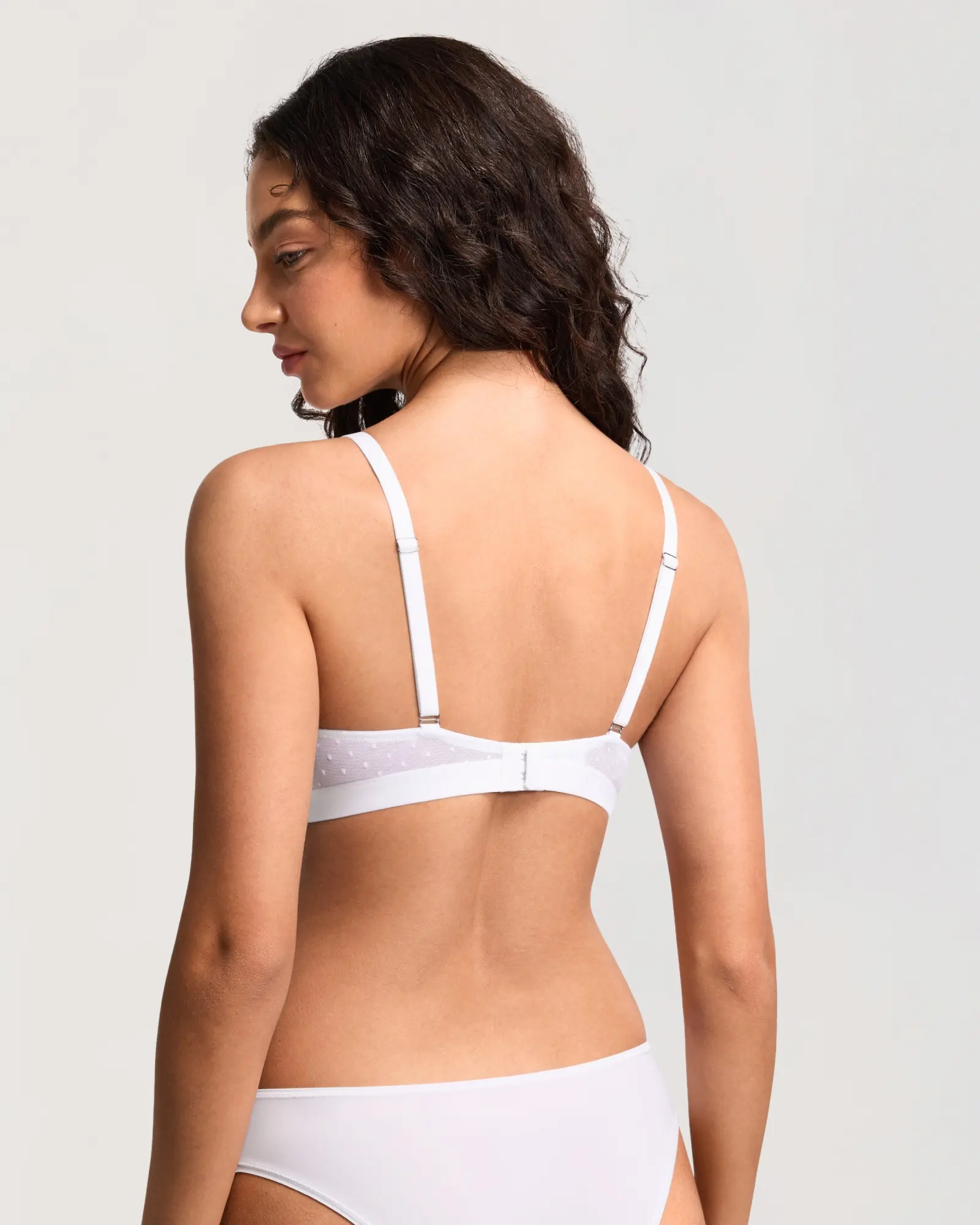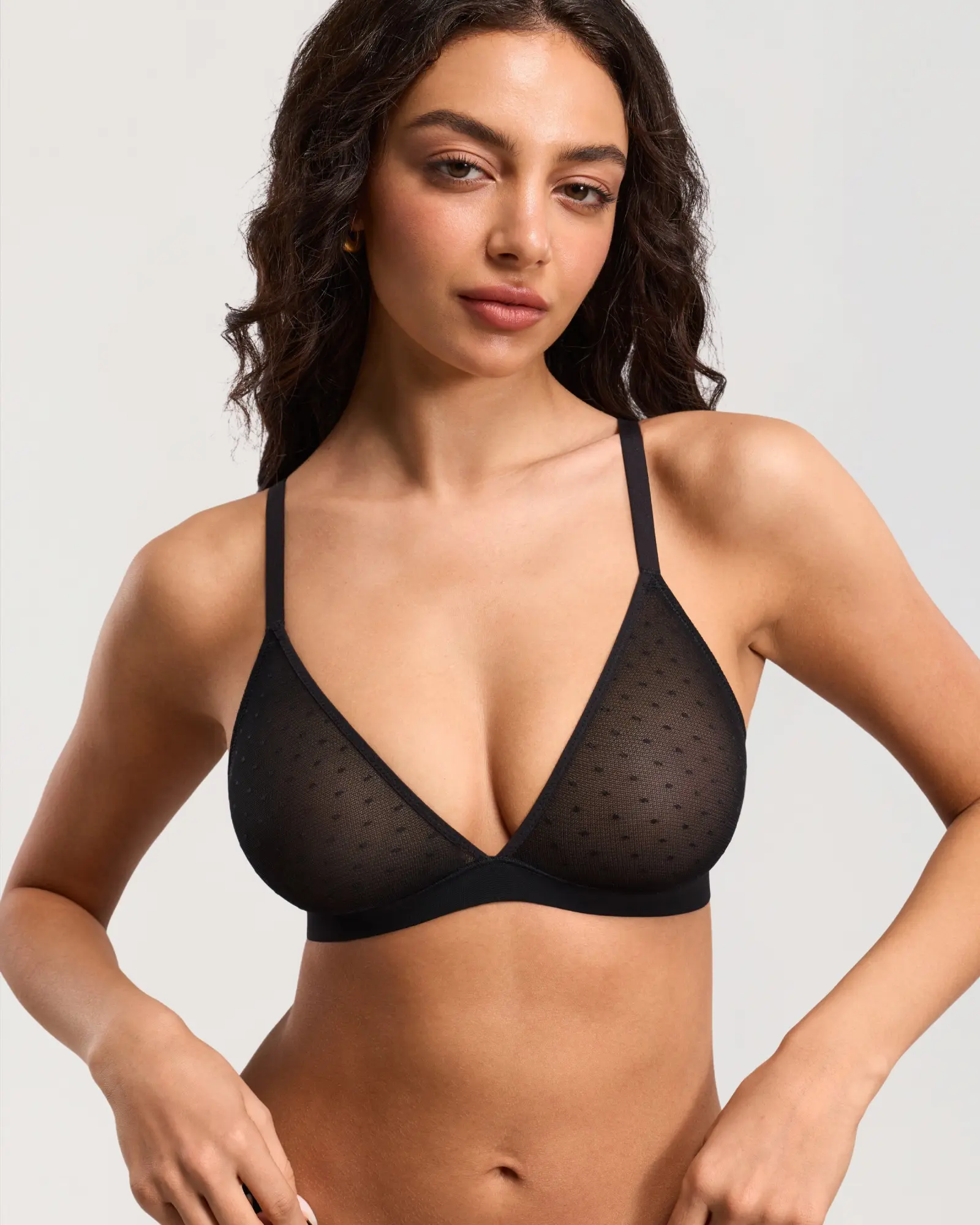 Dobreva triangle mesh bralette with small dots, wire-free and unpadded, ensures comfort all day. The dotted mesh pattern combines cuteness and elegance. Ideal for low-cut tops, it adds comfort and charm to your outfit.
