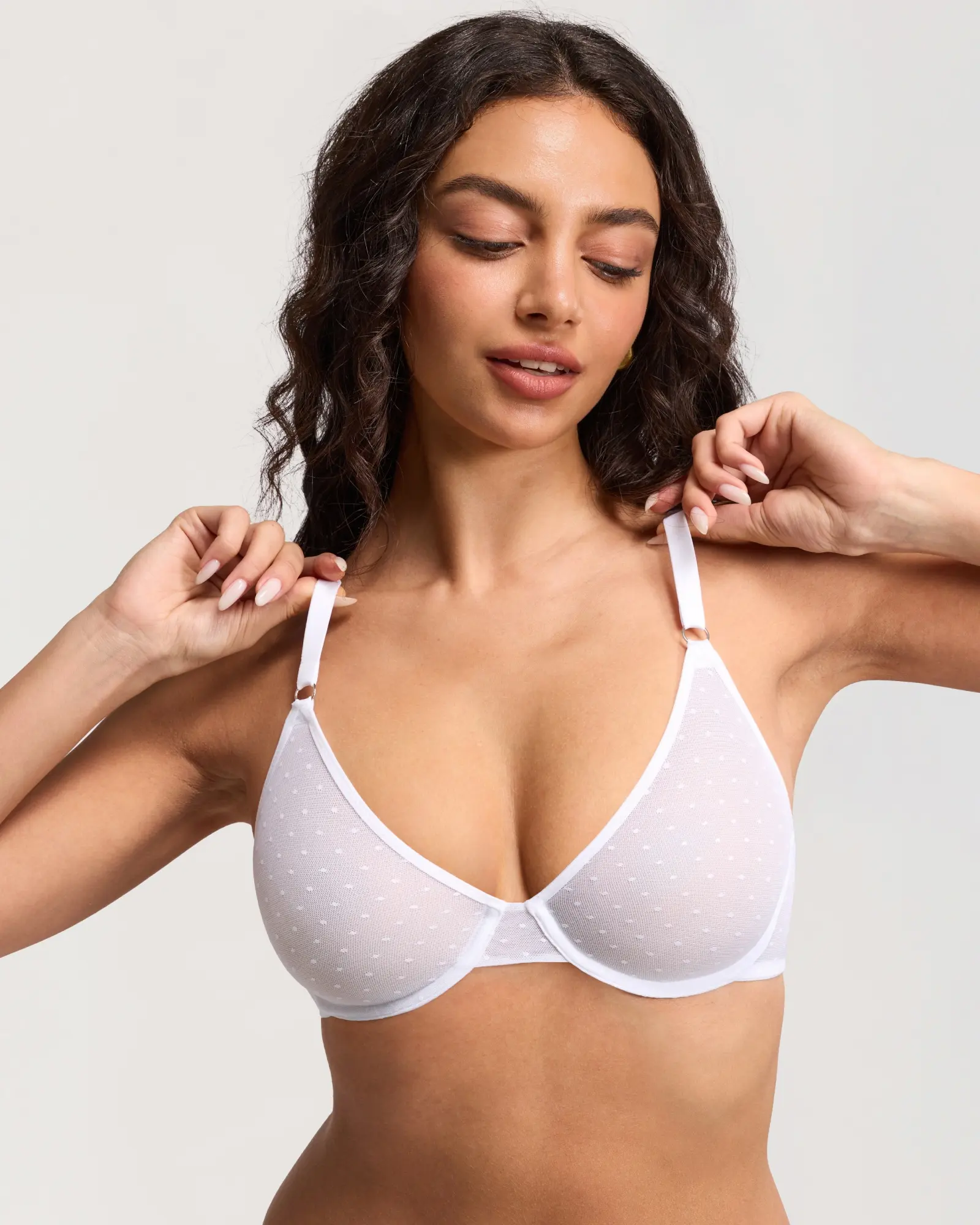 Dobreva Dotted Mesh Demi Everyday Bra: a perfect blend of cute and sexy. The playful, charming mesh bra ensures you stay comfy all day. The low neckline balconette is ideal for pairing with low cut or V neck tops. 🎀
